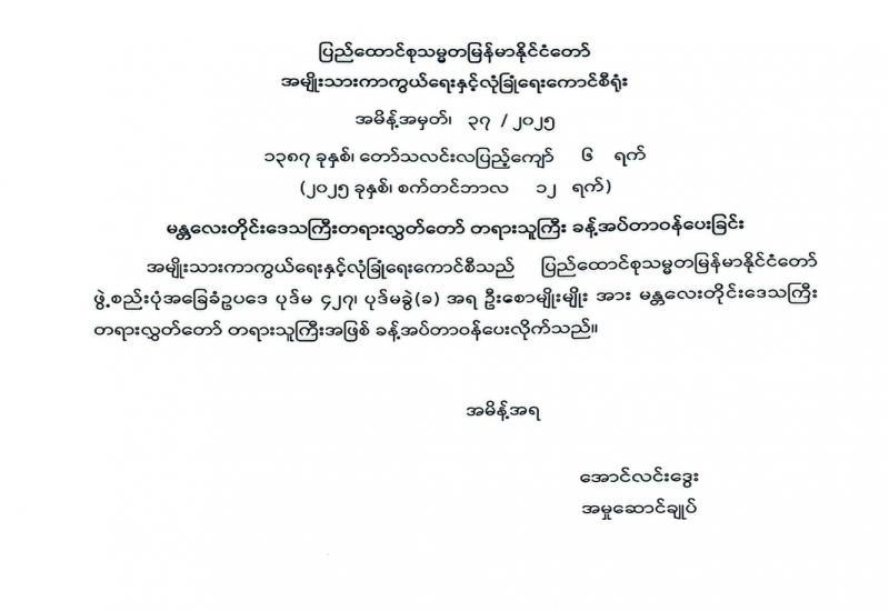 မန္တလေးတိုင်းဒေသကြီးတရားလွှတ်တော် တရားသူကြီး ခန့်အပ်တာဝန်ပေးခြင်း