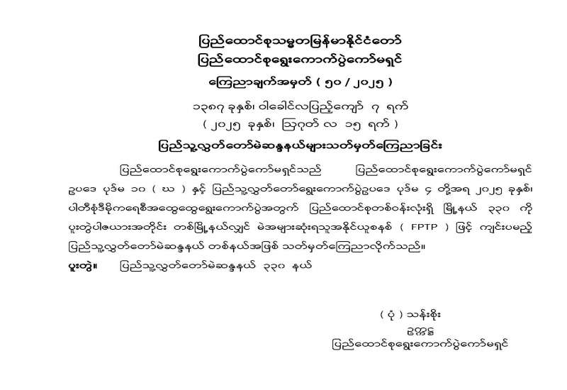 တိုင်းဒေသကြီးလွှတ်တော် သို့မဟုတ် ပြည်နယ်လွှတ်တော်ရွေးကောက်ပွဲနည်းဥပဒေများကို ထုတ်ပြန်ကြေညာခြင်း