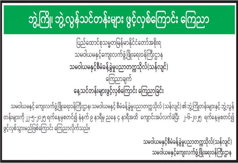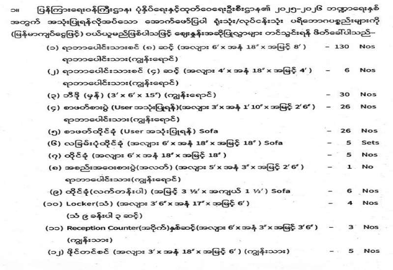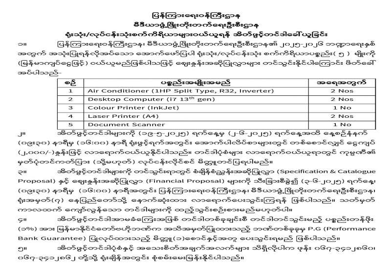 ရုံးသုံး/လုပ်ငန်းသုံးစက်ကိရိယာများ ဝယ်ယူရန်အတွက် အိတ်ဖွင့်တင်ဒါခေါ်ယူခြင်း