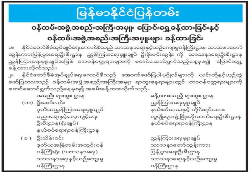 ဝန်ထမ်းအဖွဲ့အစည်းအကြီးအမှူး ပြောင်းရွှေ့ခန့်ထားခြင်းနှင့် ဝန်ထမ်းအဖွဲ့အစည်းအကြီးအမှူးများ အတည်ပြုခန့်ထားခြင်း