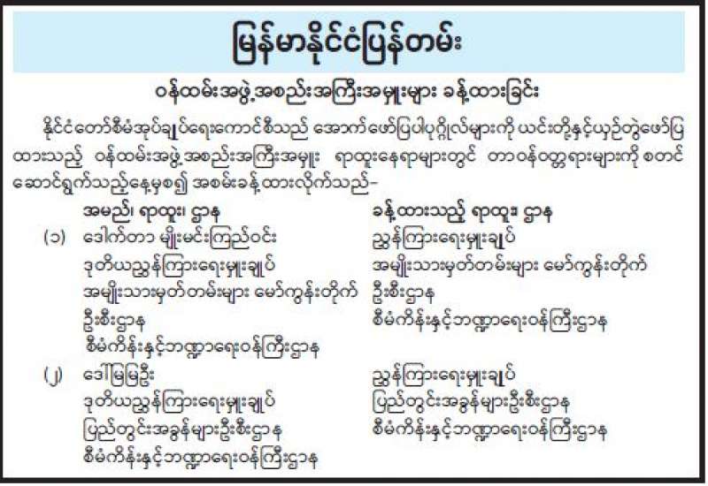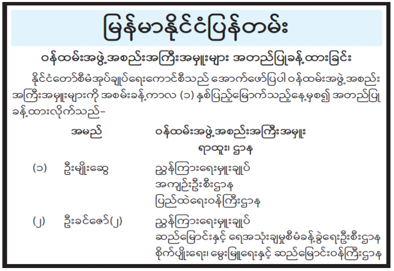 ပြည်ထောင်စုသမ္မတမြန်မာနိုင်ငံတော်အစိုးရသည် နိုင်ငံတော်နှင့် ပြည်သူများ၏ အကျိုးစီးပွားကို အစဉ်အလေးထား စီမံဆောင်ရွက်လျက်ရှိရာတွင် နိုင်ငံ့ဝန်ထမ်းများသည် အဓိကအခန်းကဏ္ဍမှ ပါဝင်ဆောင်ရွက်လျက်ရှိပါသည်။