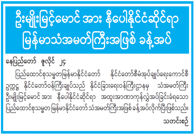 ပြည်ထောင်စုသမ္မတမြန်မာနိုင်ငံတော် နိုင်ငံတော်စီမံအုပ်ချုပ်ရေးကောင်စီဥက္ကဋ္ဌ နိုင်ငံတော်ဝန်ကြီးချုပ်သည် နိုင်ငံခြားရေးဝန်ကြီးဌာနမှ သံအမတ်ကြီး ဦးမျိုးမြင့်မောင်အား နီပေါနိုင်ငံဆိုင်ရာ အထူးအာဏာကုန်လွှဲအပ်ခြင်းခံရသော ပြည်ထောင်စုသမ္မတမြန်မာနိုင်ငံတော် သံအမတ်ကြီးအဖြစ် ခန့်အပ်လိုက်ပြီးဖြစ်သည်။