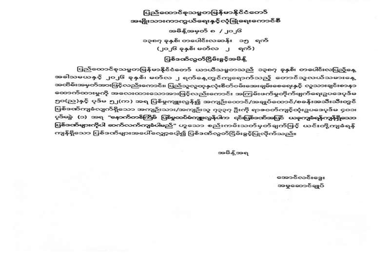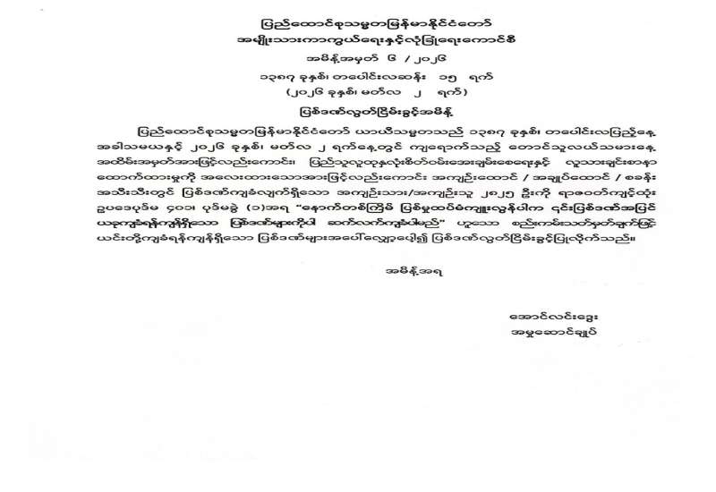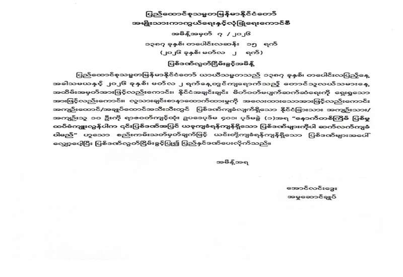 တတိယအကြိမ် တိုင်းဒေသကြီး သို့မဟုတ် ပြည်နယ်လွှတ်တော် ပထမပုံမှန်အစည်းအဝေးတက်ရောက်ရန်အတွက် လွှတ်တော်ကိုယ်စားလှယ်များ သတင်းပို့ကြရန် ထုတ်ပြန်