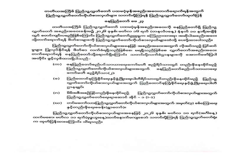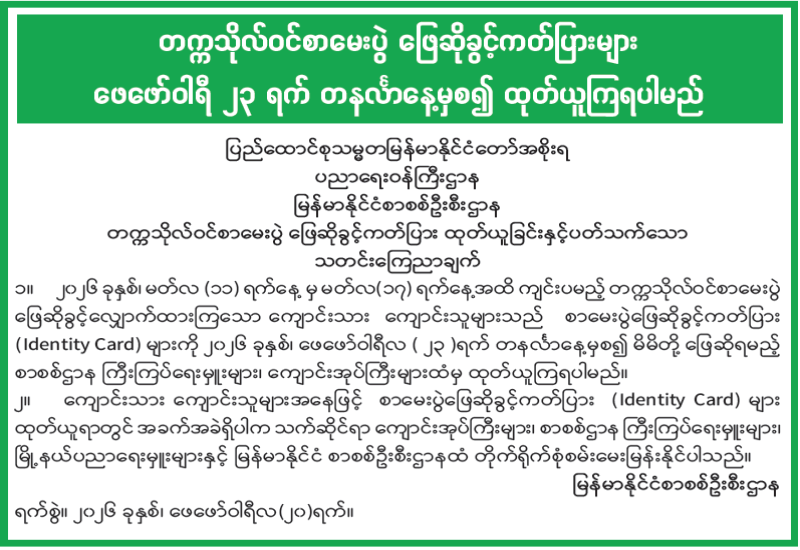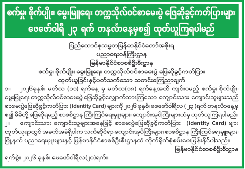 တက္ကသိုလ်ဝင်စာမေးပွဲ ဖြေဆိုခွင့်ကတ်ပြား ထုတ်ယူခြင်းနှင့်ပတ်သက်သော သတင်းကြေညာချက်