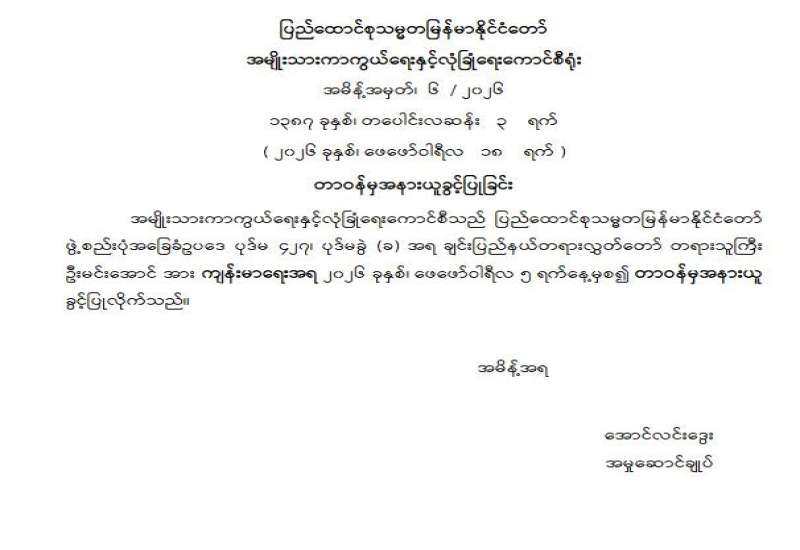 တတိယအကြိမ် ပြည်သူ့လွှတ်တော် ပထမပုံမှန်အစည်းအဝေးတက်ရောက်ရန်အတွက် ပြည်သူ့လွှတ်တော်ကိုယ်စားလှယ်များ သတင်းပို့ကြရန် ပြည်သူ့လွှတ်တော်ထုတ်ပြန်