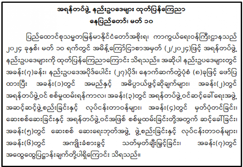 ပြည်ထောင်စုသမ္မတ မြန်မာနိုင်ငံတော် ပြည်ထောင်စုရွေးကောက်ပွဲကော်မရှင်သည် အမိန့်ကြော်ငြာစာအမှတ်(၁၂/၂၀၂၄)ဖြင့် “နိုင်ငံရေးပါတီများ မှတ်ပုံတင်ခြင်းနည်းဥပဒေများကို ပြင်ဆင်သည့်နည်းဥပဒေများ”ကို ၁၃၈၅ ခုနှစ် တပို့တွဲလပြည့်ကျော် ၁၀ ရက်၊ ၂၀၂၄ ခုနှစ် မတ်လ ၅ ရက် ရက်စွဲဖြင့် ထုတ်ပြန်ကြေညာခဲ့သည်။ အဆိုပါနည်းဥပဒေများကို နေ့စဉ်ထုတ်သတင်းစာများတွင် ထည့်သွင်းဖော်ပြပေးသွားမည်ဖြစ်ပြီး ပြည်ထောင်စုရွေးကောက်ပွဲကော်မရှင်ရုံး Website ဖြစ်သည့် www.uec.gov.mm တွင် Download ပြုလုပ်၍ ရယူနိုင်ကြောင်း သတင်းရရှိသည်။