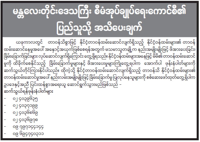 မန္တလေးတိုင်းဒေသကြီး စီမံအုပ်ချုပ်ရေးကောင်စီ၏ ပြည်သူသို့ အသိပေးချက်