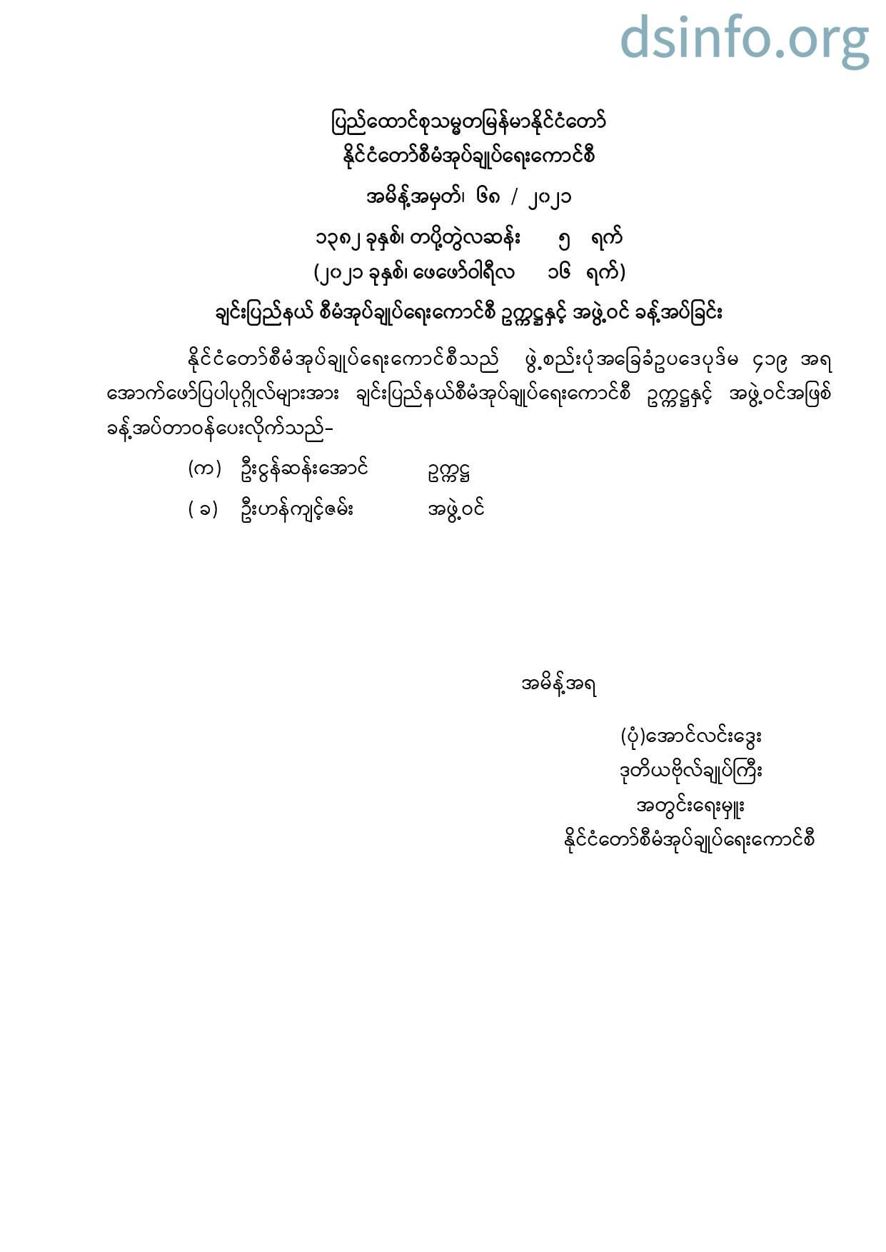 ချင်းပြည်နယ် စီမံအုပ်ချုပ်ရေးကောင်စီ ဥက္ကဋ္ဌနှင့် အဖွဲ့ဝင် ခန့်အပ်ခြင်း