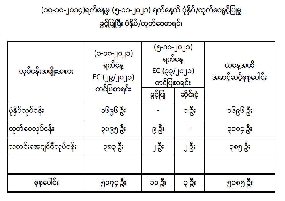 ပုံနှိပ်ခြင်းနှင့်ထုတ်ဝေခြင်းလုပ်ငန်းနည်းဥပဒေများပြဋ္ဌာန်းသည့် (၁၀-၁၀-၂၀၁၄) နေ့မှစ၍ ယနေ့အထိ ပုံနှိပ်ခြင်း လုပ်ငန်း ၁၆၉၆ ဦး၊ ထုတ်ဝေခြင်းလုပ်ငန်း ၃၁၀၄ ဦးနှင့် သတင်းအေဂျင်စီ လုပ်ငန်း ၃၈၅ ဦး၊ စုစုပေါင်းပုံနှိပ်ခြင်း၊ ထုတ်ဝေခြင်းနှင့် သတင်းအေဂျင်စီလုပ်ငန်း ၅၁၈၅ ဦးအား အသိအမှတ်ပြု လက်မှတ်များ စိစစ်ခွင့်ပြုပေးခဲ့ပြီးဖြစ်ပါသည်။