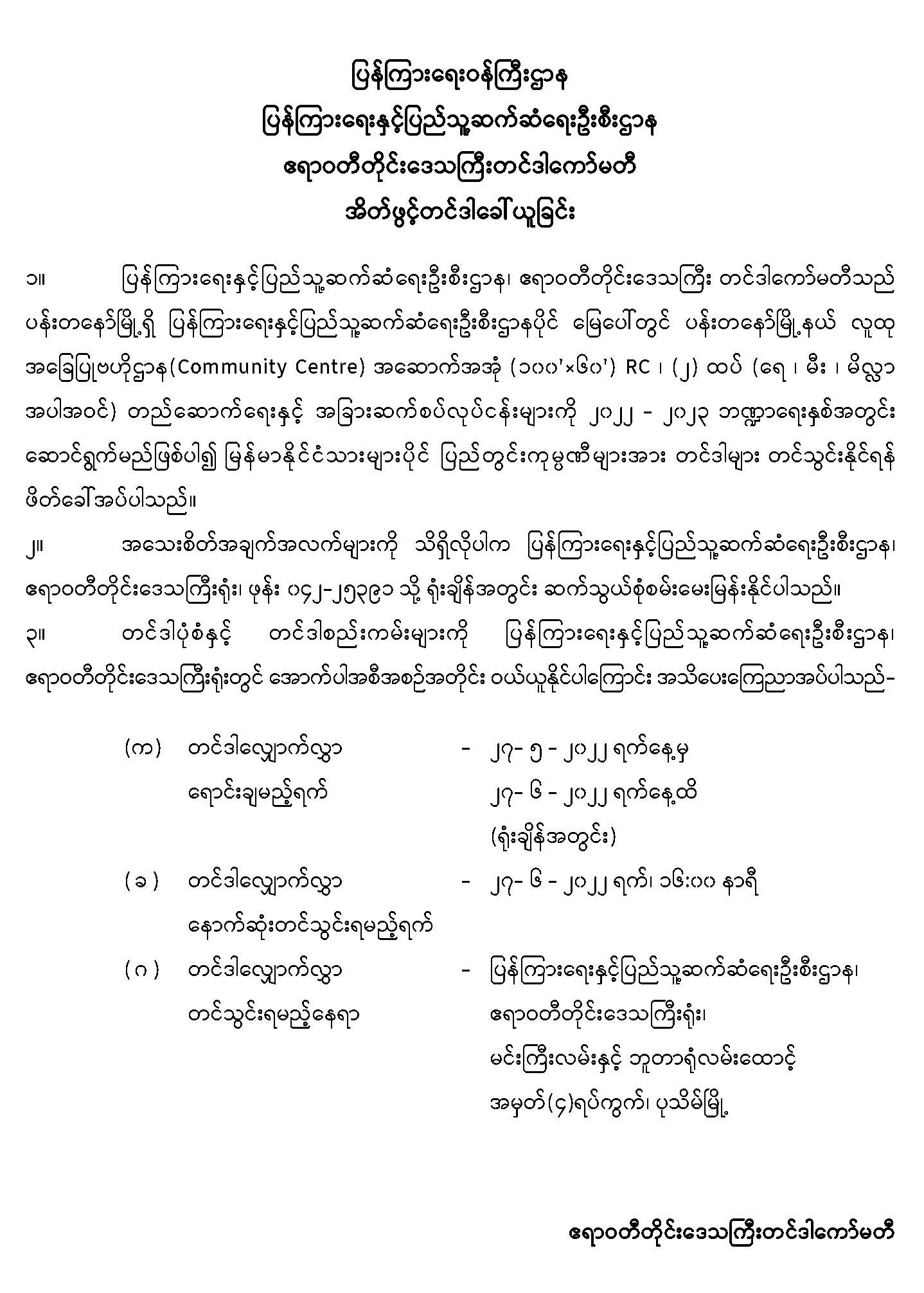 ပြန်ကြားရေးဝန်ကြီးဌာန ပြန်ကြားရေးနှင့်ပြည်သူ့ဆက်ဆံရေးဦးစီးဌာန ဧရာဝတီတိုင်းဒေသကြီးတင်ဒါကော်မတီ အိတ်ဖွင့်တင်ဒါခေါ်ယူခြင်း