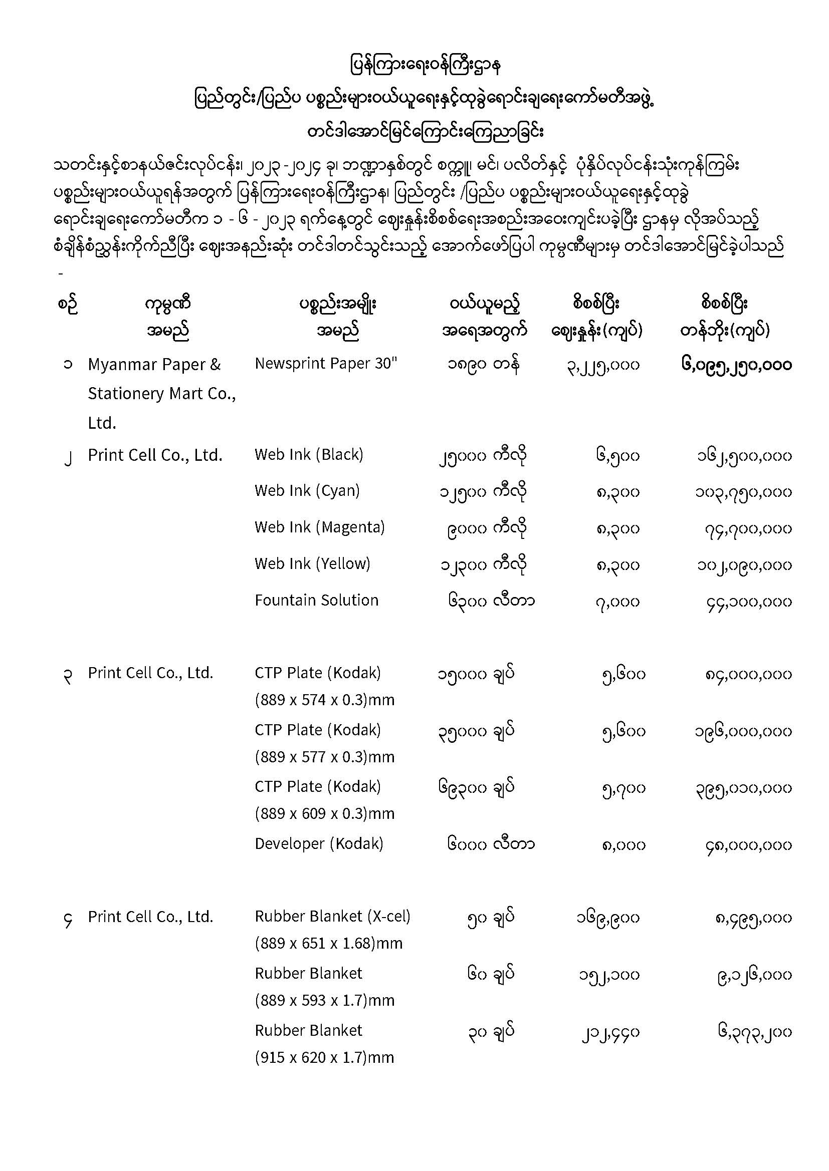 ပြန်ကြားရေးဝန်ကြီးဌာန ပြည်တွင်း/ပြည်ပ ပစ္စည်းများဝယ်ယူရေးနှင့်ထုခွဲရောင်းချရေးကော်မတီ တင်ဒါအောင်မြင်ကြောင်း ကြေညာခြင်း 06/13/2023 ပြန်ကြားရေးဝန်ကြီးဌာန ပြည်တွင်း/ပြည်ပ ပစ္စည်းများဝယ်ယူရေးနှင့်ထုခွဲရောင်းချရေးကော်မတီ တင်ဒါအောင်မြင်ကြောင်း ကြေညာခြင်း