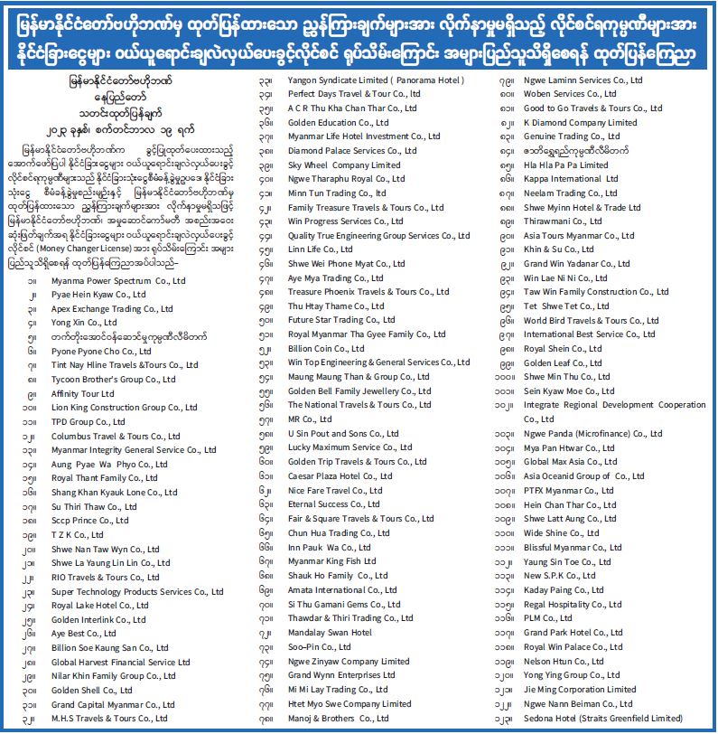 မြန်မာနိုင်ငံတော်ဗဟိုဘဏ်မှ ထုတ်ပြန်ထားသော ညွှန်ကြားချက်များအား လိုက်နာမှုမရှိသည့် လိုင်စင်ရကုမ္ပဏီများအား နိုင်ငံခြားငွေများ ဝယ်ယူရောင်းချလဲလှယ်ပေးခွင့်လိုင်စင် ရုပ်သိမ်းကြောင်း အများပြည်သူသိရှိစေရန် ထုတ်ပြန်ကြေညာ 09/20/2023