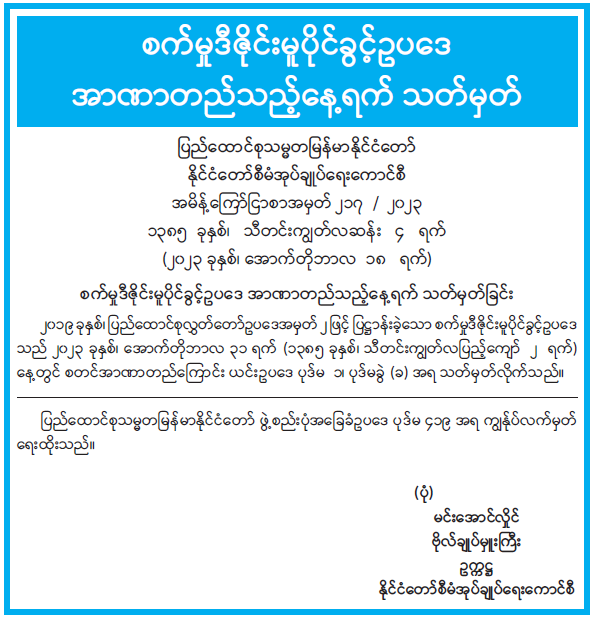 စက်မှုဒီဇိုင်းမူပိုင်ခွင့်ဥပဒေ အာဏာတည်သည့်နေ့ရက် သတ်မှတ်