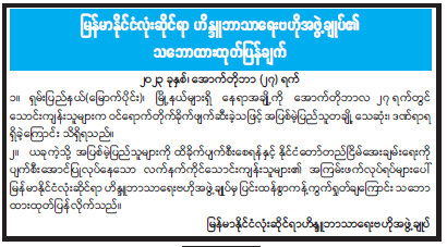 မြန်မာနိုင်ငံလုံးဆိုင်ရာ ဟိန္ဒူဘာသာရေးဗဟိုအဖွဲ့ချုပ်၏ သဘောထားထုတ်ပြန်ချက်