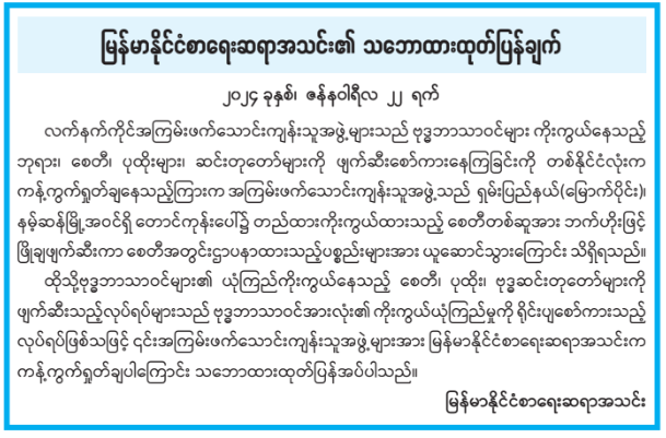 ထိုသို့ဗုဒ္ဓဘာသာဝင်များ၏ ယုံကြည်ကိုးကွယ်နေသည့် စေတီ၊ ပုထိုး၊ ဗုဒ္ဓဆင်းတုတော်များကို ဖျက်ဆီးသည့်လုပ်ရပ်များသည် ဗုဒ္ဓဘာသာဝင်အားလုံး၏ ကိုးကွယ်ယုံကြည်မှုကို ရိုင်းပျစော်ကားသည့် လုပ်ရပ်ဖြစ်သဖြင့် ၎င်းအကြမ်းဖက်သောင်းကျန်းသူအဖွဲ့များအား မြန်မာနိုင်ငံစာရေးဆရာအသင်းက ကန့်ကွက်ရှုတ်ချပါကြောင်း သဘောထားထုတ်ပြန်အပ်ပါသည်။