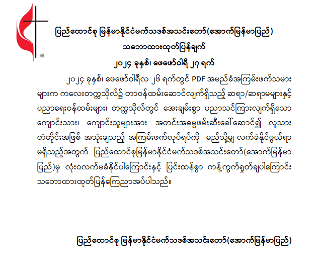 ပြည်ထောင်စုမြန်မာနိုင်ငံမက်သဒစ်အသင်းတော် (အောက်မြန်မာပြည်) သဘောထားထုတ်ပြန်ချက်