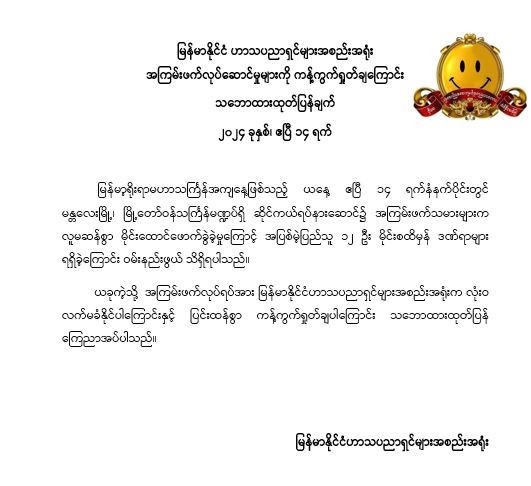 မြန်မာနိုင်ငံ ဟာသပညာရှင်များအစည်းအရုံး အကြမ်းဖက်လုပ်ဆောင်မှုများကို ကန့်ကွက်ရှုတ်ချကြောင်း သဘောထားထုတ်ပြန်ချက် 04/15/2024