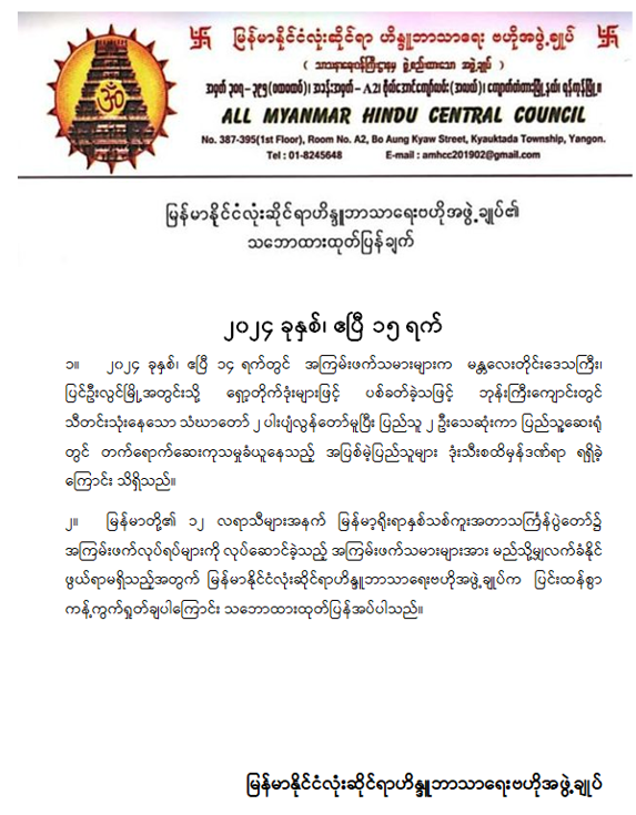 မြန်မာနိုင်ငံလုံးဆိုင်ရာ ဟိန္ဒူဘာသာရေးဗဟိုအဖွဲ့ချုပ်၏ သဘောထားထုတ်ပြန်ချက်