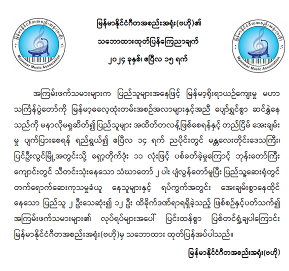 မြန်မာနိုင်ငံဂီတအစည်းအရုံး (ဗဟို) ၏ သဘောထားထုတ်ပြန်ကြေညာချက်
