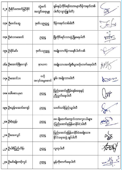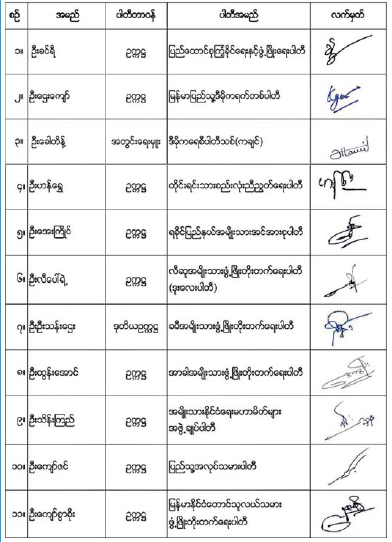 ၆။ သို့ဖြစ်ပါ၍ အကြမ်းဖက်လုပ်ရပ်များကို လုပ်ဆောင်လျက်ရှိသည့် MNDAA / TNLA / AA ၊ ယင်းတို့နှင့် ဆက်စပ်ပတ်သက်နေသော အဖွဲ့အစည်းများနှင့် ယင်းတို့၏လုပ်ရပ်များကို ဆန့်ကျင်၊ ရှုတ်ချ၊ ကန့်ကွက်ပါကြောင်း ကျွန်ုပ်တို့နိုင်ငံရေးပါတီများက လက်မှတ်ရေးထိုး ပူးတွဲသဘောထားထုတ်ပြန်ကြေညာအပ်ပါသည်။
