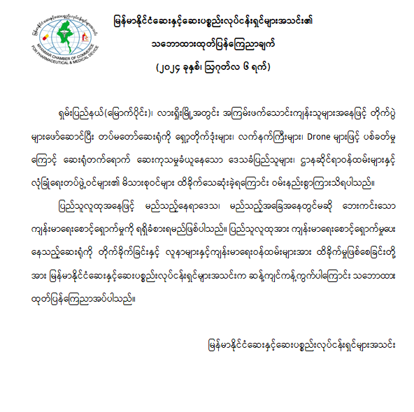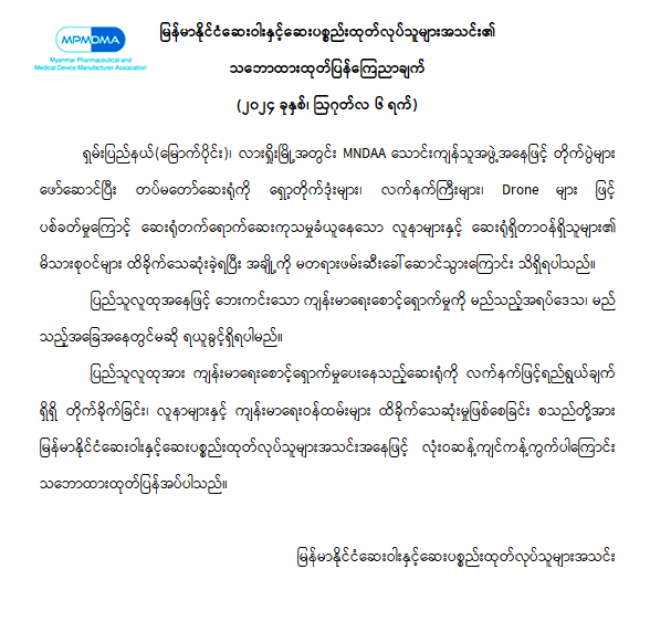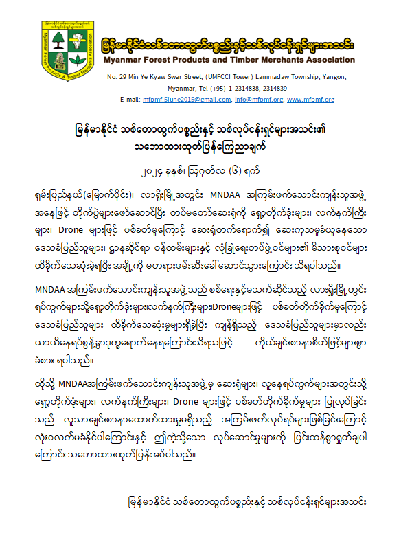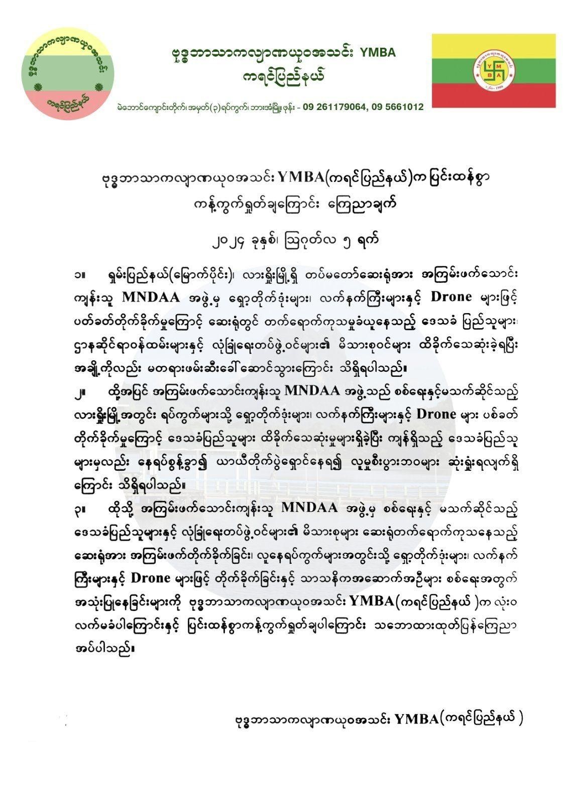 MNDAA အကြမ်းဖက် သောင်းကျန်းသူအဖွဲ့၏ အကြမ်းဖက်လုပ်ရပ်များကို လုံးဝလက်မခံကြောင်းနှင့် ပြင်းထန်စွာ ကန့်ကွက်ရှုတ်ချကြောင်း အသင်းအဖွဲ့များမှ သဘောထားများ ထုတ်ပြန်