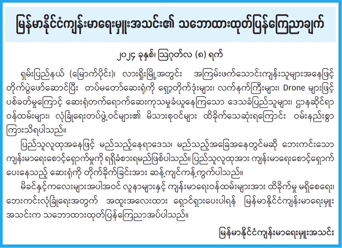 မိခင်နှင့်ကလေးများအပါအဝင် လူနာများနှင့် ကျန်းမာရေးဝန်ထမ်းများအား ထိခိုက်မှုမရှိစေရေး၊ ဘေးကင်းလုံခြုံရေးအတွက် အထူးအလေးထား ရှောင်ရှားပေးပါရန် မြန်မာနိုင်ငံကျန်းမာရေးမှူးအသင်းက သဘောထားထုတ်ပြန်ကြေညာအပ်ပါသည်။