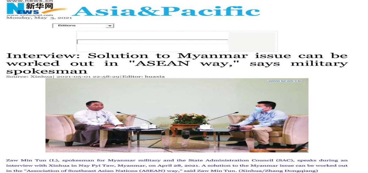 မြန်မာနိုင်ငံအရေးကို အရှေ့တောင်အာရှနိုင်ငံများအသင်းအဖွဲ့ (အာဆီယံ) ၏ နည်းလမ်းဖြင့် ဖြေရှင်းနိုင်ကြောင်း နိုင်ငံတော်စီမံအုပ်ချုပ်ရေးကောင်စီနှင့် မြန်မာ့တပ်မတော်မှ ပြောရေးဆိုခွင့်ရှိသူ ဗိုလ်ချုပ်ဇော်မင်းထွန်းက ဆင်ဟွာ (Xinhua) သတင်းဌာနနှင့် မကြာသေးမီကပြုလုပ်သော တွေ့ဆုံမေးမြန်းခန်းတွင် ပြောသည်။