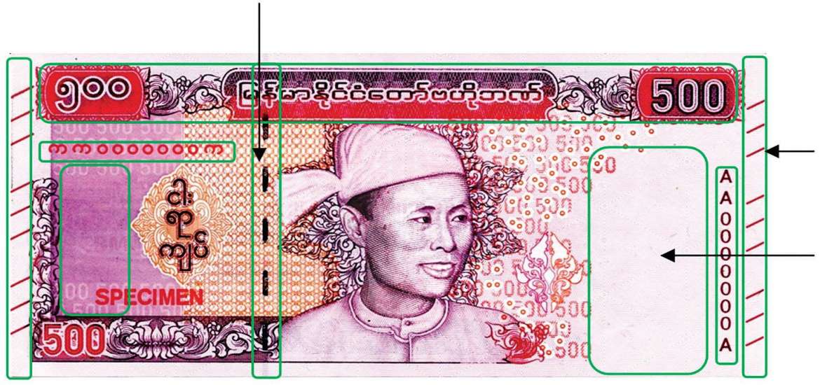 ငွေစက္ကူရဲ့မျက်နှာစာဘက်ရှိ ဘယ်/ညာ အစွန်းတွေမှာ အမြင်အာရုံအားနည်းသူတွေအတွက် လက်နဲ့ ထိတွေ့စမ်းသပ်ကြည့်ရင် အာရုံခံသိရှိနိုင်တဲ့ ဖောင်းကြွလိုင်းတို မျဉ်းကြောင်းငယ်(၉) ကြောင်းစီ ရိုက်နှိပ်ထားပါတယ်။ ငွေစက္ကူပုံစံသစ်ကို အလင်းရောင် မှာ ထောင်ကြည့်ရင် ငွေစက္ကူမျက်နှာစာ ဘက် ဗိုလ်ချုပ် အောင်ဆန်းရုပ်ပုံရဲ့ လက်ဝဲဘက်မှာ ဗိုလ်ချုပ်အောင်ဆန်း ရုပ်ပုံနဲ့ ငွေစက္ကူရဲ့ တန်ဖိုးဂဏန်း ၅၀၀ ရေစာကို ရှင်းလင်းစွာတွေ့မြင်နိုင်ပါတယ်။