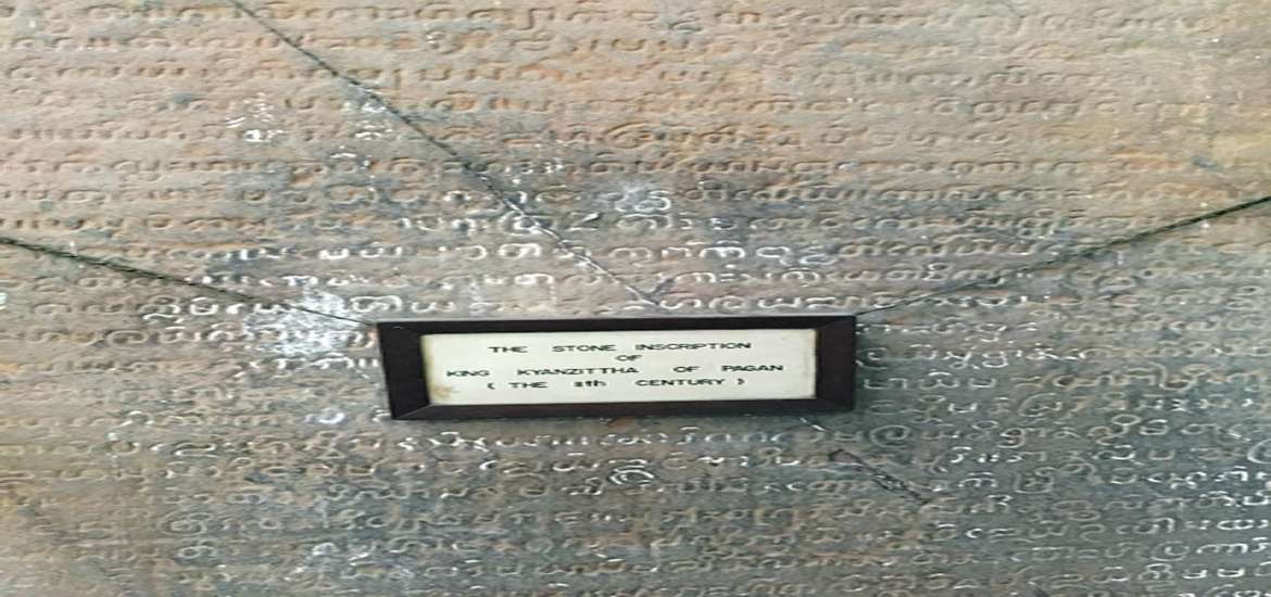 ဒီကျောက်စာတိုင်ကို သတိပြုမိပြီး သေသေ ချာချာကြည့်လိုက်မယ်ဆိုရင် ကျောက်စာတိုင်မှာ ချိတ်ဆွဲထားတဲ့ "THE STONE INSCRIPTION OF KING KYANSITTHA OF PAGAN (THE 11th CENTURY)" ဆိုတဲ့ ဆိုင်းဘုတ်ငယ်ကလေးကို တွေ့ရမှာ ဖြစ်ပါတယ်။ လွန်ခဲ့တဲ့ နှစ်ပေါင်းတစ်ထောင်နီးပါးက အင်မတန်ရှေးကျတဲ့ ကျောက်စာတိုင်ကြီးဖြစ်ပေမဲ့ နေဒဏ်၊ လေဒဏ်၊ မိုးဒဏ်တွေကင်းလွတ်တဲ့ ရန်ကုန်တက္ကသိုလ်စာကြည့်တိုက် အဆောက်အအုံထဲမှာ အကောင်းပကတိ တည်ရှိနေပါတယ်။