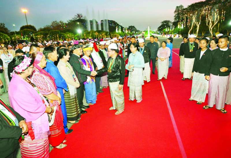 ပြည်ထောင်စုသမ္မတမြန်မာနိုင်ငံတော်ယာယီသမ္မတ နိုင်ငံတော်လုံခြုံရေးနှင့်အေးချမ်းသာယာရေးကော်မရှင်ဥက္ကဋ္ဌ ဗိုလ်ချုပ်မှူးကြီး သတိုးမဟာသရေစည်သူ သတိုးသီရိသုဓမ္မ မင်းအောင်လှိုင်နှင့် ဇနီးဒေါ်ကြူကြူလှတို့က တည်ခင်းဧည့်ခံသည့် ၂၀၂၆ ခုနှစ် (၇၉) နှစ်မြောက် ပြည်ထောင်စုနေ့အထိမ်းအမှတ် ဂုဏ်ပြုညစာစားပွဲအခမ်းအနားကို ယနေ့ညပိုင်းတွင် နေပြည်တော်ရှိ မြို့တော်ခန်းမ ဥပစာရင်ပြင်၌ ကျင်းပသည်။