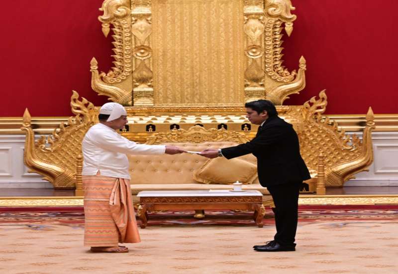 ပြည်ထောင်စုသမ္မတမြန်မာနိုင်ငံတော် ယာယီသမ္မတ နိုင်ငံတော်လုံခြုံရေးနှင့် အေးချမ်းသာယာရေးကော်မရှင်ဥက္ကဋ္ဌ ဗိုလ်ချုပ်မှူးကြီး မင်းအောင်လှိုင်ထံ မြန်မာနိုင်ငံဆိုင်ရာ ဆော်ဒီအာရေဗျနိုင်ငံ သံအမတ်ကြီး H.E. Mr. Maziad Mohammed M Al Howishan က ယနေ့နံနက် ၁၁ နာရီတွင် နေပြည်တော်ရှိ အမျိုးသားကာကွယ်ရေးနှင့်လုံခြုံရေးကောင်စီရုံး၊ သံတမန်ဆောင်ဧည့်ခန်းမ၌ ၎င်း၏သံအမတ်ခန့်အပ်လွှာကို ပေးအပ်သည်။