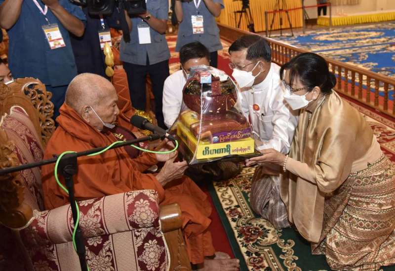 ပြည်ထောင်စုသမ္မတမြန်မာနိုင်ငံတော်၊ နိုင်ငံတော်စီမံအုပ်ချုပ်ရေးကောင်စီ၏ ၂၀၂၂ ခုနှစ်၊ ဝါဆိုသင်္ကန်းဆက်ကပ်လှူဒါန်းပွဲ မင်္ဂလာအခမ်းအနားကို ယနေ့နံနက်ပိုင်းတွင် နေပြည်တော်ကောင်စီနယ်မြေ၊ ဥပ္ပါတသန္တိစေတီတော်မြတ်ကြီးပရိဝုဏ်တော်အတွင်းရှိ သာသနာ့မဟာဗိမာန်တော်ကြီး၌ ကျင်းပပြုလုပ်ရာ နိုင်ငံတော်စီမံအုပ်ချုပ်ရေးကောင်စီဥက္ကဋ္ဌ နိုင်ငံတော်ဝန်ကြီးချုပ် ဗိုလ်ချုပ်မှူးကြီးမင်းအောင်လှိုင်နှင့် ဇနီးဒေါ်ကြူကြူလှ တို့တက်ရောက်ကြည်ညို၍ ဝါဆိုသင်္ကန်းနှင့် လှူဖွယ်ပစ္စည်းများ ဆက်ကပ်လှူဒါန်းသည်။