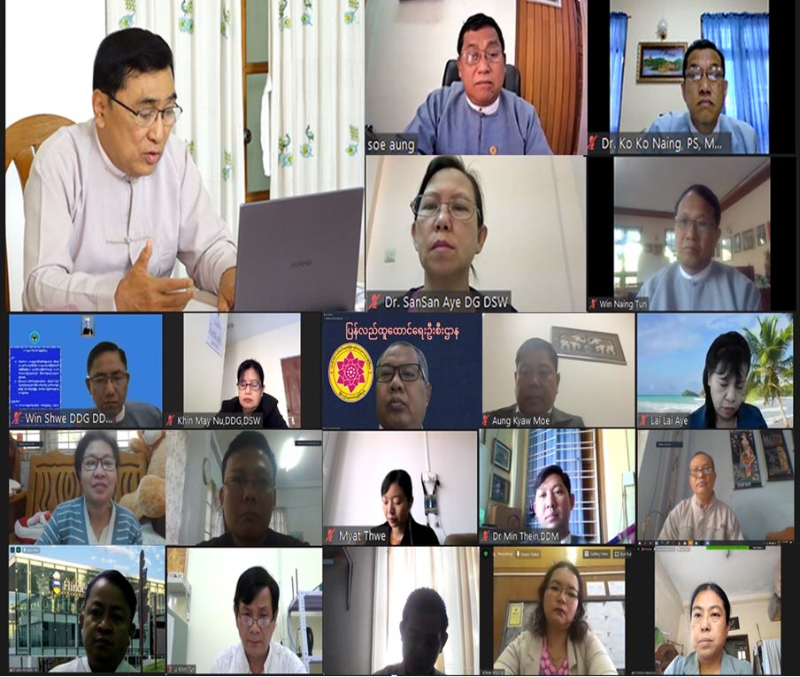 သဘာဝဘေးအန္တရာယ်ဆိုင်ရာစီမံခန့်ခွဲမှု ဥပဒေကို ပြန်လည် သုံးသပ်ခြင်း၊ မြန်မာ့လူမှု ကာကွယ် စောင့်ရှောက်ရေးအထောက်အပံ့ဥပဒေ(မူကြမ်း)ရေးဆွဲခြင်းနှင့် လူကုန်ကူးမှုတားဆီးနှိမ်နင်းရေးဥပဒေ (မူကြမ်း)ရေးဆွဲထားမှုနှင့်ပတ်သက်၍ ဝန်ကြီးဌာနနှင့် သက်ဆိုင်သောကဏ္ဍများအပေါ် အကြံပြုဆွေး နွေးညှိနှိုင်းမှုများကို Virtual Meeting ဖြင့်ကျင်းပသည်။