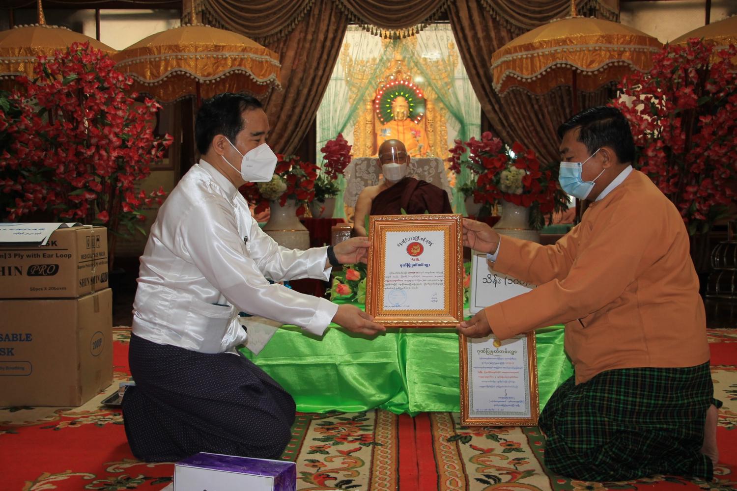 ထို့နောက် သီရိမင်္ဂလာကြခတ်ဝိုင်းပရိယတ္တိစာသင်တိုက် ပဓာနနာယကဆရာတော် ဘဒ္ဒန္တဉေယျ ဓမ္မာဘိဝံသမှ ကိုဗစ်-၁၉ ရောဂါ ကာကွယ်ဆေးဝယ်ယူနိုင်ရေး အတွက် အလှူငွေကျပ်သိန်း (၃၀၀)နှင့် ပဲခူးမြို့အထွေထွေရောဂါ ကု‌ဆေးရုံကြီးတွင် အရေးပေါ်ဆေးဝါးများ ဝယ်ယူနိုင်ရေး အတွက် အလှူငွေကျပ်သိန်း(၁၀၀)တို့အား ပေးအပ်လှူဒါန်းရာ ပဲခူးတိုင်းဒေသကြီးဝန်ကြီးချုပ် ဦးဝင်းသိန်းနှင့် တိုင်းဒေသကြီးပြည်သူ့ကျန်းမာရေးနှင့် ကုသရေးဦးစီးဌာနမှူး၊ ပဲခူးဆေးရုံအုပ်ကြီး ဒေါက်တာရန်နိုင်မောင်တို့က လက်ခံရယူပြီး ဂုဏ်ပြုမှတ်တမ်း ပြန်လည်ပေးအပ်ကာ ပဲခူးတိုင်း ဒေသကြီးဝန်ကြီးချုပ် ဦးဝင်းသိန်းမှ ကျန်းမာရေးအထောက်အကူပစ္စည်းများအား ဆရာတော်ကြီး ထံ ပေးအပ်လှူဒါန်းခဲ့ကြောင်း သိရှိရသည်။