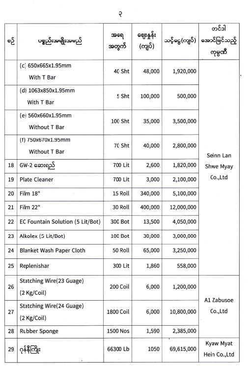 ၂၆-၁-၂ဝ၂၁ ရက်နေ့၊ (၁၀ : ၀ဝ)နာရီ အချိန်တွင် ပြန်ကြားရေးဝန်ကြီးဌာန ၊ ဝန်ကြီးရုံး စုဝေးခန်းမ၌ ကျင်းပပြုလုပ်သော ပုံနှိပ်ရေးနှင့်ထုတ်ဝေရေးဦးစီးဌာနမှ ၂၀၂၀ - ၂၀၂၁ ဘဏ္ဍာနှစ် (၂၀၂၁-၂၀၂၂ ပညာသင်နှစ်)အတွက် အခြေခံပညာကျောင်းသုံးပြဋ္ဌာန်းစာအုပ်များ ရိုက်နှိပ်ရန်နှင့် အခြားပုံနှိပ်လုပ်ငန်းများတို့အတွက် လိုအပ်သော စက္ကူ ၊ မင် နှင့် ပုံနှိပ်ရေးပစ္စည်းများ ဝယ်ယူရန် ကုန်ကြမ်းပစ္စည်းများဝယ်ယူရေးနှင့် စိစစ်ရေးကော်မတီမှ စျေးနှုန်းစိစစ်ခဲ့ရာ တင်ဒါအောင်မြင် ခဲ့သော အောက်ပါကုမ္ပဏီများမှ ယှဉ်တွဲပါစျေးနှုန်းနှင့် အရေအတွက်တို့ဖြင့် တင်ဒါအောင်မြင် ကြောင်း ကြေညာအပ်ပါသည်-