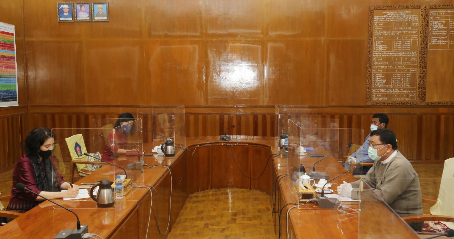 လူမှုဝန်ထမ်း၊ ကယ်ဆယ်ရေးနှင့် ပြန်လည်နေရာချထားရေးဝန်ကြီးဌာန ပြည်ထောင်စုဝန်ကြီး ဒေါက်တာ ဝင်းမြတ်အေးသည် နေရပ်စွန့်ခွာရသူများအတွက် လူသားချင်းစာနာမှု အကူအညီပေးအပ်ခြင်း ပြန်လည်နေရာ ချထားရေး၊ ပြန်လည်ထူထောင်ရေးနှင့် သက်ဆိုင်သော လုပ်ငန်းများ ပူးပေါင်းဆောင်ရွက်နိုင်ရန်အတွက် နားလည်မှုစာချွန်လွှာ လက်မှတ်ရေးထိုးထားသော ကုလသမဂ္ဂ ဒုက္ခသည်များဆိုင်ရာ မဟာမင်းကြီးရုံး(UNHCR) အဖွဲ့အစည်းမှ မြန်မာနိုင်ငံ ဆိုင်ရာ ကိုယ်စားလှယ် Ms. Hai Kyung Jun နှင့် ဒုတိယကိုယ်စားလှယ် Ms. Yukiko Iriyama တို့ ဦးဆောင်သောအဖွဲ့အား ယနေ့ နံနက်ပိုင်းက ဝန်ကြီးရုံးအစည်းအဝေးခန်းမ၌ လက်ခံတွေ့ဆုံ သည်။