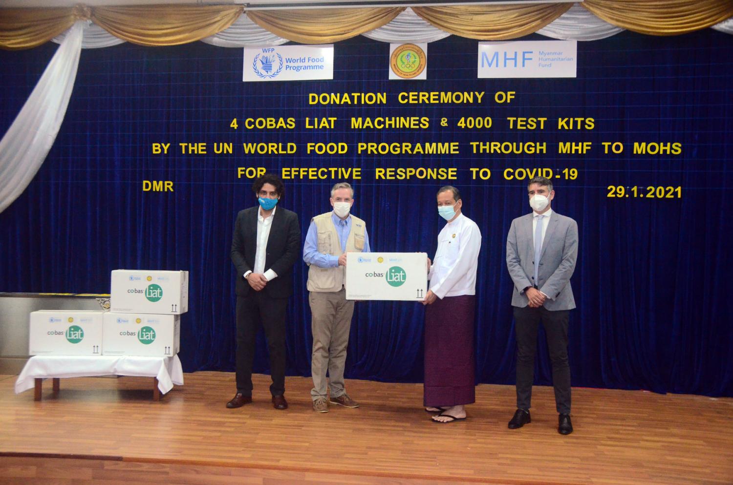 ထို့နောက် WFP မှ မြန်မာနိုင်ငံဆိုင်ရာဌာနေကိုယ်စားလှယ် Mr. Stephen Anderson က ကိုဗစ်-၁၉ ရောဂါရှာဖွေရေးတွင် အသုံးပြုရန်အတွက် အမေရိကန်ဒေါ်လာ ၂၆၀၀၀၀ တန်ဖိုးရှိ Cobas Liat ဓာတ်ခွဲစက်ပစ္စည်း ၄ လုံး နှင့် ဆက်စပ်ဓာတ်ခွဲ ခန်းသုံးပစ္စည်း ၄၀၀၀ ကို လွှဲပြောင်းပေးအပ်ရာ ဆေးသုတေသနဦးစီးဌာန ညွှန်ကြားရေးမှူးချုပ် ပါမောက္ခ ဒေါက်တာဇော်သန်းထွန်းက လက်ခံရယူပြီး ဂုဏ်ပြု မှတ်တမ်းလွှာ ပြန်လည်ပေးအပ်သည်။