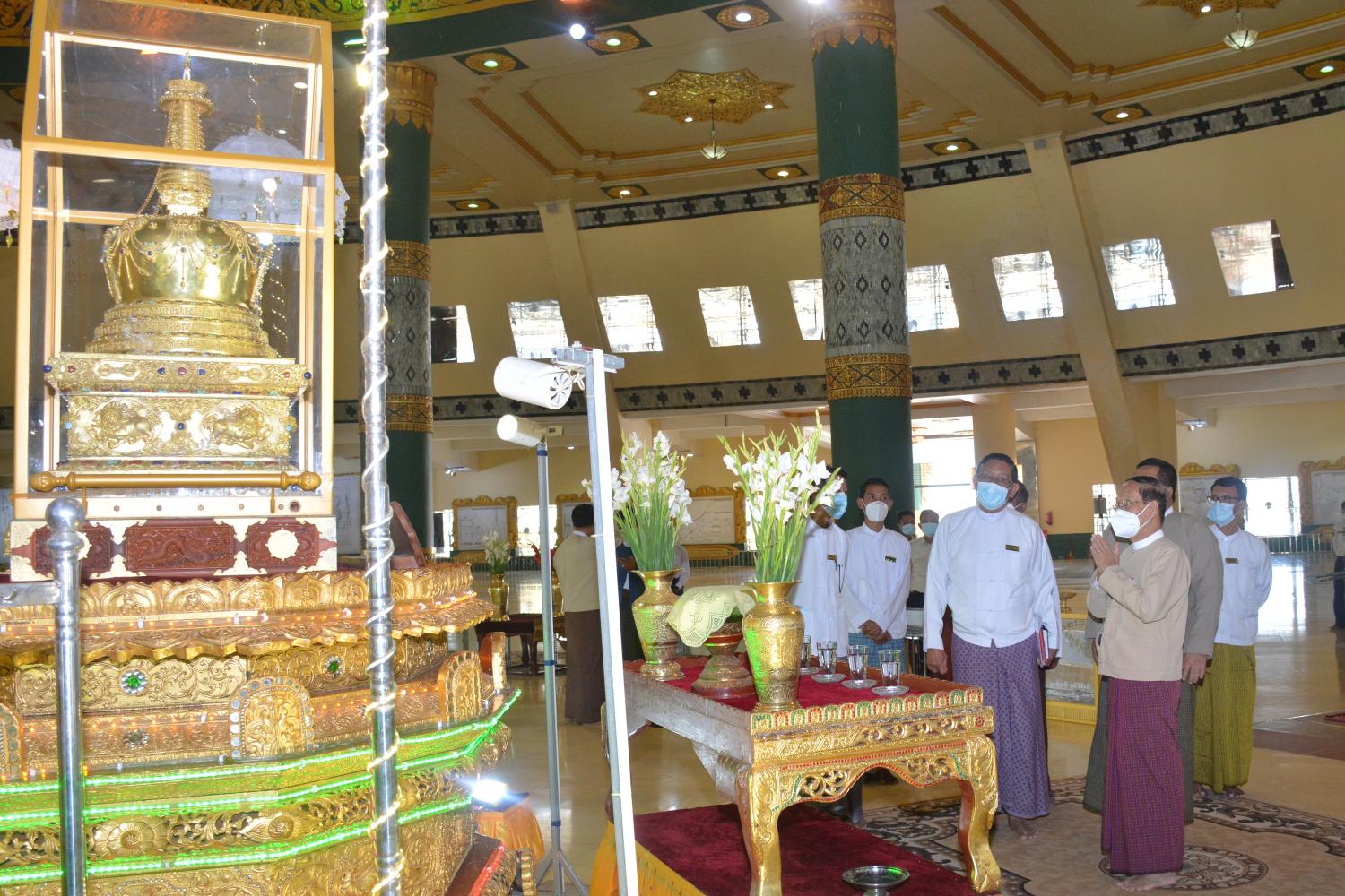 ထို့နောက် ဥပ္ပါတသန္တိစေတီတော်မြတ်ကြီး၏ တည်ထားကိုးကွယ်မှုဆိုင်ရာ သမိုင်းကြောင်းများ နှင့် စေတီတော်ကြီး ဘက်စုံပြုပြင်မွမ်းမံပြီးစီးမှု များကို ဂေါပကအဖွဲ့က ရှင်းလင်းတင်ပြရာ ပြည်ထောင်စုဝန်ကြီးက လိုအပ်သည်များ ဖြည့်စွက်ပြောကြားပြီး ဥပ္ပါတသန္တိစေတီတော် မြတ်ကြီးအား ရဟန်း၊ ရှင်၊ လူ ပြည်သူအများ ဖူးမြော်ကြည်ညိုခွင့်ရရှိနိုင်ရေး စေတီတော် ပြန်လည်ဖွင့်လှစ်ရာတွင် ကျန်းမာရေးနှင့်အားကစားဝန်ကြီးဌာန၏ ကိုဗစ်-၁၉ ရောဂါထိန်းချုပ်၊ တားဆီး၊ ကာကွယ်ရေးဆိုင်ရာ ညွှန်ကြားချက်များနှင့်အညီ ဆောင်ရွက်သွားရန် ဥပ္ပါတသန္တိ စေတီတော်မြတ်ကြီး ဂေါပကအဖွဲ့အား မှာကြားခဲ့ကြောင်း သိရသည်။