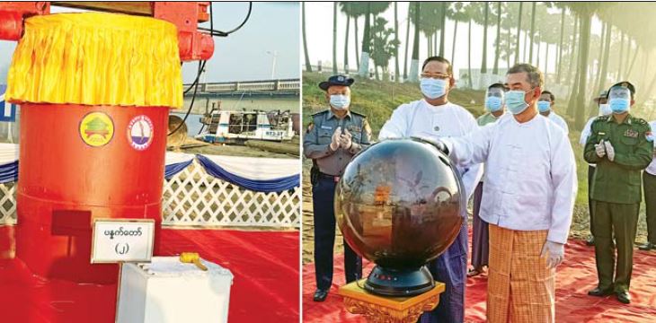 ယင်းနောက် ပြည်ထောင်စုဝန်ကြီး ဦးရွှေလေးနှင့် တိုင်းဒေသကြီးစီမံ အုပ်ချုပ်ရေးကောင်စီဥက္ကဋ္ဌ ဦးတင်အောင်တို့က ကမြောကင်း တံတားသစ် ပန္နက်ကို မင်္ဂလာအချိန်တွင် Vibro Hammer ဖြင့် စက်ခလုတ်နှိပ် ရိုက်သွင်းကာ (ဝဲပုံ)အမွှေးနံ့သာရည်များ ပက်ဖျန်းပေးသည်။