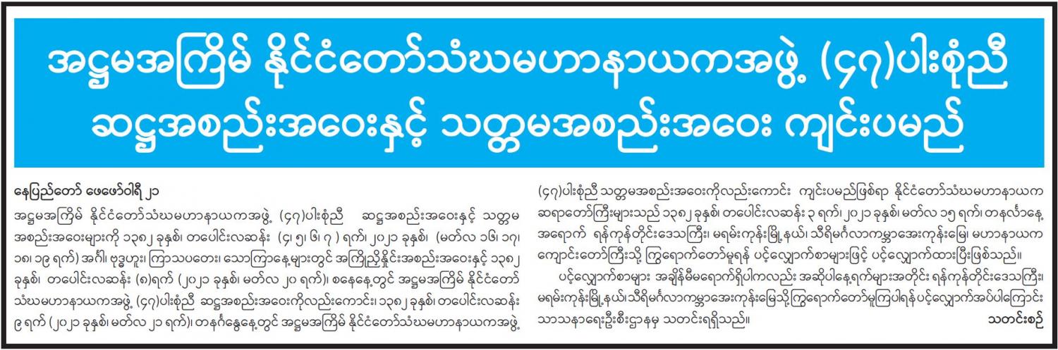 အဋ္ဌမအကြိမ် နိုင်ငံတော်သံဃမဟာနာယကအဖွဲ့ (၄၇)ပါးစုံညီ ဆဋ္ဌအစည်းအဝေးနှင့် သတ္တမအစည်းအဝေး ကျင်းပမည်