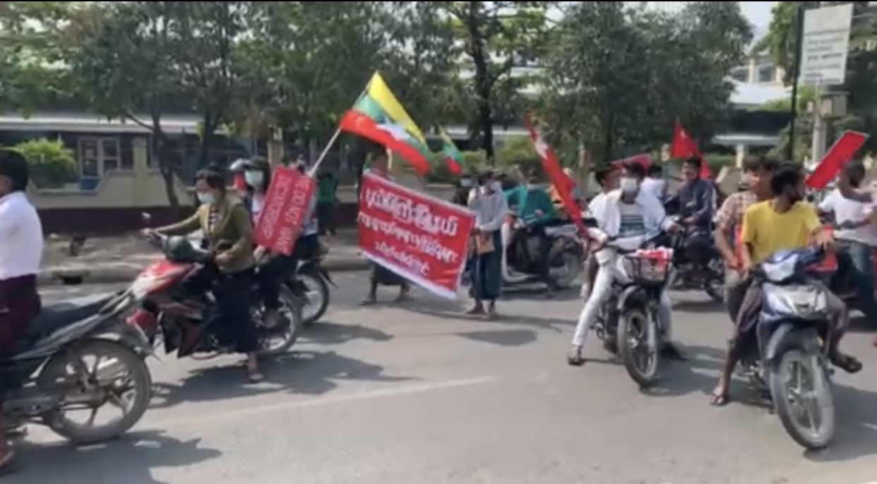 မန္တလေးတိုင်းဒေသကြီး၊ ချမ်းအေးသာစံမြို့နယ်၊ လမ်း(၃၀)(၆၈/၇၀) လမ်းကြားတွင် လူစုလူဝေး ၄၀၀ ကျော်ခန့်သည်လည်းကောင်း၊ မွန်းလွဲပိုင်းတွင် ချမ်းအေးသာစံမြို့နယ်၊ (၃၅/၈၅) လမ်းကြား မြတောင် ကျောင်းအရှေ့တွင် လူစုလူဝေး ၂၅၀ ခန့်သည်လည်းကောင်း၊ (၆၂/၁၀၄) (A) လမ်းထောင့်တွင် အင်အား ၁၀၀ သည်လည်းကောင်း အများပြည်သူသွားလာအသုံးပြုနေကြသည့် လမ်းမများပေါ်တွင် လမ်းပိတ်ဆို့ မှုများ ပြုလုပ်ကာ ကြွေးကြော်သံအမျိုးမျိုး အော်ဟစ်ဆူပူလျက်ရှိကြောင်း သိရသည်။