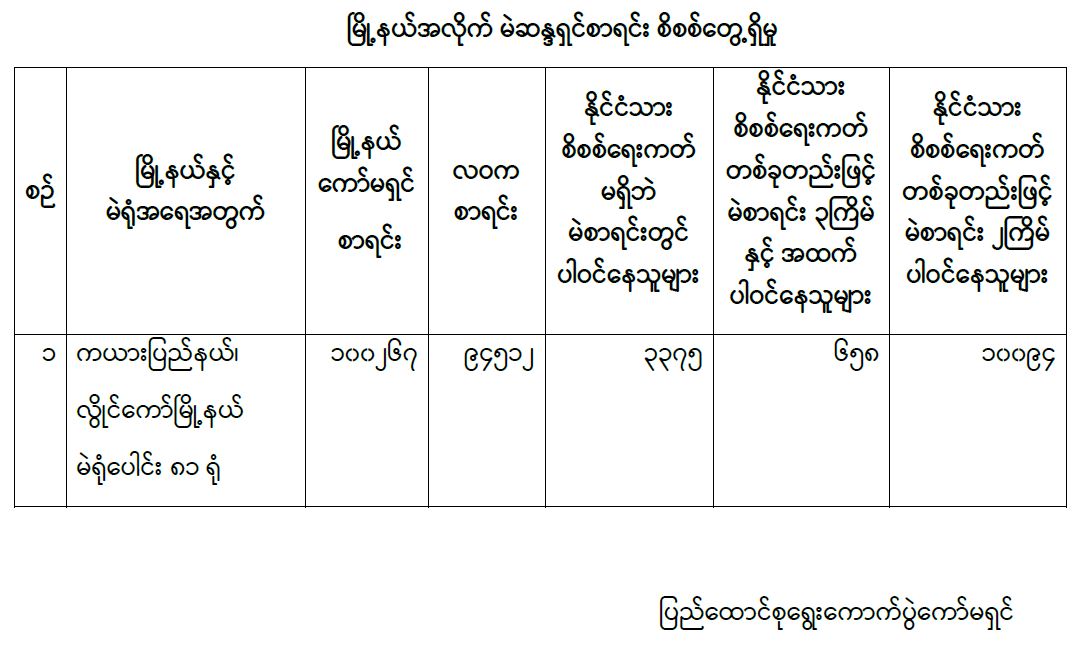 ၂၀၂၁ ခုနှစ်၊ ဖေဖော်ဝါရီလ ၂၈ ရက် ၁။ ပြည်ထောင်စု‌ရွေးကောက်ပွဲကော်မရှင်သည် ၂၀၂၀ ပြည့်နှစ် နိုဝင်ဘာလ ၈ ရက်နေ့တွင် ကျင်းပပြုလုပ်သည့် ပါတီစုံဒီမိုကရေစီအထွေထွေရွေးကောက်ပွဲနှင့်စပ်လျဉ်း၍ ကယားပြည်နယ်၊ လွိုင်ကော်မြို့နယ် ၏ ဆန္ဒမဲပေးမှုများကို စစ်ဆေးခဲ့သည်။ ၂။ စစ်ဆေးတွေ့ရှိချက်များအရ ကယားပြည်နယ်၊ လွိုင်ကော်မြို့နယ်တွင် ယခင် ရွေးကောက်ပွဲကော်မရှင်က ထုတ်ပြန်ကြေညာခဲ့သည့် မဲဆန္ဒရှင်စာရင်းမှာ ၁၀၀၂၆၇ ဦး ဖြစ်ပြီး အလုပ်သမား၊ လူဝင်မှုကြီးကြပ်ရေးနှင့်ပြည်သူ့ အင်အားဝန်ကြီးဌာန၏ ၂၀၂၀ ပြည့်နှစ်၊ နိုဝင်ဘာလ စာရင်းအရ အသက် ၁၈ နှစ် ပြည့်ပြီး ဆန္ဒမဲပေးပိုင်ခွင့်ရှိသူများမှာ ၉၄၅၁၂ ဦး ဖြစ်သည်။ မဲဆန္ဒရှင် စာရင်းများတွင် နိုင်ငံသား၊ ဧည့်နိုင်ငံသား၊ နိုင်ငံသားပြုခွင့်ရသူ၊ လက်မှတ်မရှိသူများမှာ ၃၃၇၅ ဦး၊ နိုင်ငံသားစိစစ်ရေးကတ်ပြားအမှတ် တစ်ခုတည်းဖြင့် မဲစာရင်းတွင် ၃ ကြိမ်နှင့်အထက် ပါဝင် နေသူများမှာ ၆၅၈ ဦး၊ ၂ ကြိမ် ပါဝင်နေသူများမှာ ၁၀၀၉၄ ဦး ဖြစ်သည်။ ၃။ မြို့နယ်အလိုက် စစ်ဆေးတွေ့ရှိချက်များမှာ အောက်ပါအတိုင်း ဖြစ်သည်-