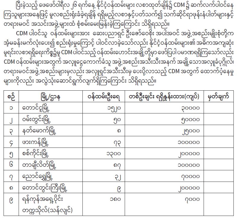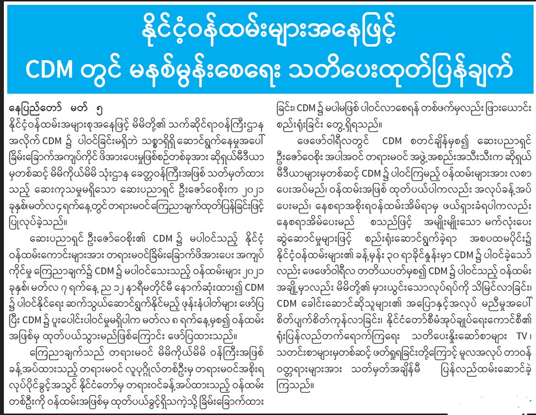 နိုင်ငံ့ဝန်ထမ်းများအနေဖြင့် CDM တွင် မနစ်မွန်းစေရေး သတိပေးထုတ်ပြန်ချက်