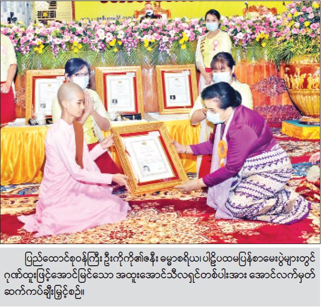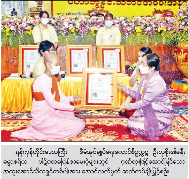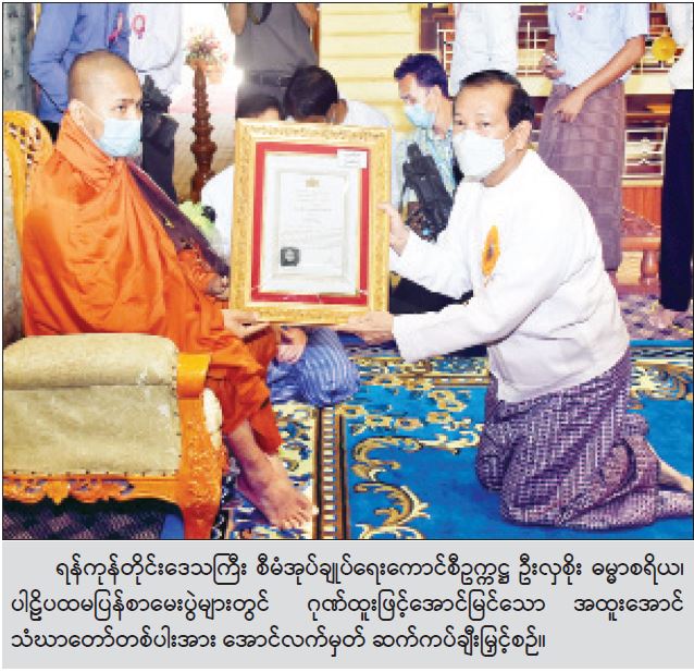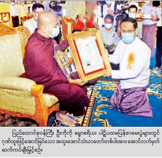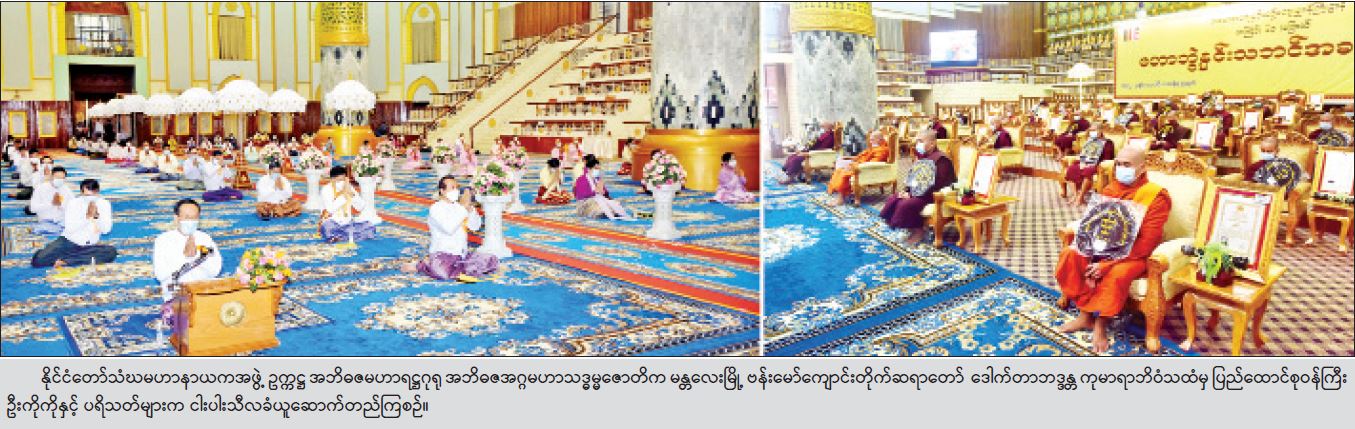 ရန်ကုန် မတ် ၁၅ ပြည်ထောင်စုသမ္မတမြန်မာနိုင်ငံတော် သာသနာရေးနှင့် ယဉ်ကျေးမှုဝန်ကြီး ဌာနက ကြီးမှူးကျင်းပသော အကြိမ်(၆၀)မြောက် မဟာဘွဲ့နှင်း သဘင်အခမ်းအနားကို ယနေ့ မွန်းလွဲ ၁ နာရီတွင် ရန်ကုန်မြို့ သီရိမင်္ဂလာကမ္ဘာအေးကုန်းမြေရှိ မဟာပါသာဏလိုဏ်ဂူ သိမ်တော်ကြီး၌ ကျင်းပသည်။ အခမ်းအနားသို့ နိုင်ငံတော်သံဃမဟာနာယကအဖွဲ့ ဥက္ကဋ္ဌ အဘိဓဇမဟာရဌဂုရု အဘိဓဇအဂ္ဂမဟာသဒ္ဓမ္မဇောတိက မန္တလေးမြို့ ဗန်းမော်ကျောင်းတိုက်ဆရာတော် ဒေါက်တာ ဘဒ္ဒန္တကုမာရာဘိဝံသ အမှူးပြုသော နိုင်ငံတော် သံဃမဟာနာယက ဆရာတော်ကြီးများနှင့် ဓမ္မာစရိယ စာမေးပွဲ၊ ပါဌိ ပထမပြန်စာမေးပွဲများတွင် အောင်မြင် တော်မူကြသည့် သာသနာ့ အာဇာနည် အရှင်သူမြတ်များ ကြွရောက်တော်မူကြပြီး သာသနာရေးနှင့် ယဉ်ကျေးမှုဝန်ကြီးဌာန ပြည်ထောင်စုဝန်ကြီး ဦးကိုကိုနှင့် ဇနီး ၊ ရန်ကုန်တိုင်းဒေသကြီး စီမံအုပ်ချုပ်ရေးကောင်စီ ဥက္ကဋ္ဌ ဦးလှစိုးနှင့်ဇနီး ၊ ရန်ကုန်တိုင်းဒေသကြီး စီမံအုပ်ချုပ်ရေးကောင်စီအဖွဲ့ဝင်များနှင့် သာသနာရေး နှင့် ယဉ်ကျေးမှုဝန်ကြီးဌာနမှ တာဝန်ရှိသူများ တက်ရောက်ကြည်ညိုကြသည်။ ရှေးဦးစွာ နိုင်ငံတော်သံဃမဟာနာယကအဖွဲ့ဥက္ကဋ္ဌ အဘိဓဇမဟာရဌဂုရု အဘိဓဇ အဂ္ဂမဟာ သဒ္ဓမ္မဇောတိက မန္တလေးမြို့ ဗန်းမော်ကျောင်းတိုက်ဆရာတော် ဒေါက်တာဘဒ္ဒန္တ ကုမာရာဘိဝံသထံမှ ပြည်ထောင်စုဝန်ကြီး ဦးကိုကိုနှင့် ပရိသတ်များက ငါးပါးသီလခံယူ ဆောက်တည်ကြသည်။ ထို့နောက် နိုင်ငံတော် သံဃမဟာနာယကအဖွဲ့ ဥက္ကဋ္ဌ ဗန်းမော်ကျောင်းတိုက်ဆရာတော် ဒေါက်တာဘဒ္ဒန္တကုမာရာ ဘိဝံသ က သာရဏီယ သြဝါဒ ကထာကို မြွတ်ကြားချီးမြှင့် တော်မူ သည်။ (နိုင်ငံတော်သံဃမဟာနာယကအဖွဲ့ ဥက္ကဋ္ဌ၏ သာရဏီယသြဝါဒကထာကို စာမျက်နှာ-၅တွင် သီးခြားဖော်ပြ ထားပါသည်။ ) ယင်းနောက် သာသနာရေးနှင့် ယဉ်ကျေးမှုဝန်ကြီးဌာန ပြည်ထောင်စုဝန်ကြီး ဦးကိုကိုက သာသနာရေးဆိုင်ရာများကို လျှောက်ထားရာတွင် ဝန်ကြီး ဦးကိုကိုက သာသနာရေးဆိုင်ရာ များကို လျှောက်ထားရာတွင် မြတ်စွာဘုရားရှင်၏ သာသနာတော်မြတ်ကြီး၌ လေ့လာ သင်ကြားရေး ပရိယတ္တိသာသနာ၊ လိုက်နာကျင့်သုံးရေး ပဋိပတ္တိသာသနာ၊ ထိုးထွင်းသိမြင်ရေး ပဋိဝေဓသာသနာဟူ၍ သာသနာတော်သုံးရပ်ရှိသည်တွင် ပရိယတ္တိသာသနာတော်သည် အခြေခံ အရင်းအမြစ်ကျလှပါကြောင်း၊ သို့ပါ သောကြောင့် ပရိယတ္တိသာသနာတော်ကြီး တိုးတက်စည်ပင် ပြန့်ပွားစေရန် အတွက် ပရိယတ္တိစာမေးပွဲများ ကျင်းပလာခဲ့သည်မှာ သာလွန်မင်းတရားကြီး လက်ထက် သက္ကရာဇ် ၁၀၀၀ ပြည့်နှစ် မှစ၍ သီပေါမင်းတိုင်အောင် ဆင်ယင်ကျင်းပ သာသနာပြုတော်မူလာခဲ့ကြသည်မှာ ယနေ့တိုင်အောင်ပင် ဖြစ်ပါကြောင်း။ ၁၃၄၂ ခုနှစ်၊ နယုန်လတွင် ကျင်းပခဲ့သော သာသနာတော် သန့်ရှင်းတည်တံ့ ပြန့်ပွားရေး ပထမ
