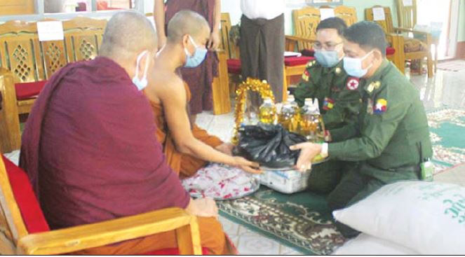 နေပြည်တော် မတ် ၁၇ ဘုန်းတော်ကြီး ကျောင်းများ၊ သာသနာ့နွယ်ဝင် သီလရှင် ကျောင်းများနှင့် ဘာသာရေး ကျောင်းများတွင် ဆွမ်းအဆင်ပြေ စေရေးအတွက် တပ်မတော် (ကြည်း၊ ရေ၊ လေ)အရာရှိစစ်သည် အရာထမ်း၊ အမှုထမ်းများက တိုင်းစစ်ဌာနချုပ်များ အလိုက် မြို့နယ်အသီးသီး၌ ဆွမ်းဆန်တော် ဆီ၊ ဆား၊ ပဲအမယ်လေးမျိုး နှင့် လှူဖွယ်ပစ္စည်းများလှူဒါန်းခြင်း၊ နေ့ဆွမ်း၊ အရုဏ်ဆွမ်း ဆက်ကပ် လှူဒါန်းခြင်းနှင့် ကျန်းမာရေး စစ်ဆေးမှုများကို ဆောင်ရွက်လျက်ရှိသည်။ ထိုသို့ ဆောင်ရွက်လျက်ရှိရာ ယနေ့တွင် မွန်ပြည်နယ် မော်လမြိုင်မြို့၊ ရန်ကုန်တိုင်းဒေသ ကြီး မှော်ဘီမြို့နယ်၊ ဧရာဝတီတိုင်းဒေသကြီး ပုသိမ်မြို့၊ စစ်ကိုင်းတိုင်းဒေသကြီး မုံရွာမြို့နယ်နှင့် ကလေးမြို့တို့ရှိဘုန်းတော် ကြီးကျောင်းများနှင့် စာသင် တိုက်များ စုစုပေါင်း ၅ ကျောင်းသို့ ဆွမ်းဆန်တော်၊ ဆီ၊ ဆား၊ ပဲ အမယ်လေးမျိုး၊ COVID- 19 ရောဂါ ကာကွယ်ရေး အထောက် အကူပြုပစ္စည်းများနှင့် လှူဖွယ် ပစ္စည်းများကို လည်းကောင်း၊ စစ်ကိုင်းတိုင်းဒေသကြီး မုံရွာမြို့ နယ်နှင့် ကလေးမြို့၊ မန္တလေးတိုင်းဒေသကြီး ပုသိမ်ကြီးမြို့နယ်နှင့် ပြည်ကြီးတံခွန်မြို့နယ်တို့ရှိ ဘုန်းတော်ကြီး ကျောင်းများနှင့် သီလရှင်စာသင်တိုက် စုစုပေါင်း ၁၂ ကျောင်းရှိ သံဃာတော်များနှင့် သာသနာ့နွယ်ဝင် သီလရှင်များ၊ အားနေ့ဆွမ်းနှင့်အရုဏ်ဆွမ်းများ ကိုလည်းကောင်း သက်ဆိုင်ရာ တိုင်းစစ်ဌာနချုပ်များ အလိုက် တိုင်းမှူးများနှင့် တာဝန်ရှိသူများ က သွားရောက်၍ ဆက်ကပ် လှူဒါန်းကြသည်။ ထို့အပြင် ပဲခူးတိုင်းဒေသကြီး ပြည်ခရိုင် ပြည်မြို့ မြို့သစ်ရပ်ကွက်ရှိ ကြည်သာအေးမြ ဘုန်းတော်ကြီးကျောင်း ဆရာ တော် ဘဒ္ဒန္တကောသလ္လအမှူးပြုသော သံဃာတော်များအား မတ် ၁၆ ရက် နံနက်ပိုင်းတွင် ကာကွယ်ရေးဦးစီးချုပ်ရုံး (ကြည်း) မှ ဒုတိယဗိုလ်ချုပ်ကြီး ဖုန်းမြတ်နှင့် အဖွဲ့ဝင်များက အဆိုပါကျောင်း တိုက်သို့ သွားရောက်ဖူးမြော် ကြည်ညိုပြီး ဆွမ်းဆန်တော်၊ ဆီ၊ ဆား၊ ပဲ အမယ်လေးမျိုးနှင့် လှူဖွယ်ပစ္စည်းများ ဆက်ကပ် လှူဒါန်းကြသည်။ ၎င်းအပြင် မွန်ပြည်နယ် မော်လမြိုင်မြို့ မြဆည်းဆာ ဘိုးဘွားရိပ်သာနှင့် ဧရာဝတီတိုင်း ဒေသကြီး ပုသိမ်မြို့ နိဓာရုံညောင်ပင်သာ ပရိယတ္တိစာသင် တိုက်များရှိ ဆရာတော်၊ သံဃာ တော်များ၊ သာသနာ့နွယ်ဝင်သီလရှင်များနှင့် ဘိုးဘွားများအား တပ်မတော်မှ ဆေးအဖွဲ့များက လိုအပ်သည့်ကျန်းမာရေးစစ်ဆေး ပေးခြင်းများ ဆောင်ရွက်ပေး သည်။ ယင်းသို့ဆောင်ရွက်ပေးနေ မှုများကို သက်ဆိုင်ရာ တိုင်းစစ် ဌာနချုပ်များမှ တိုင်းမှူးများနှင့် အဖွဲ့ဝင်များက သွားရောက် ကြည့်ရှုအားပေးပြီး အာဟာရ ဖြည့် စားသောက်ဖွယ်ရာများနှင့် နဝကမ္မအလှူငွေများ ပေးအပ်လှူဒါန်