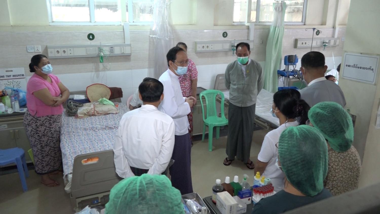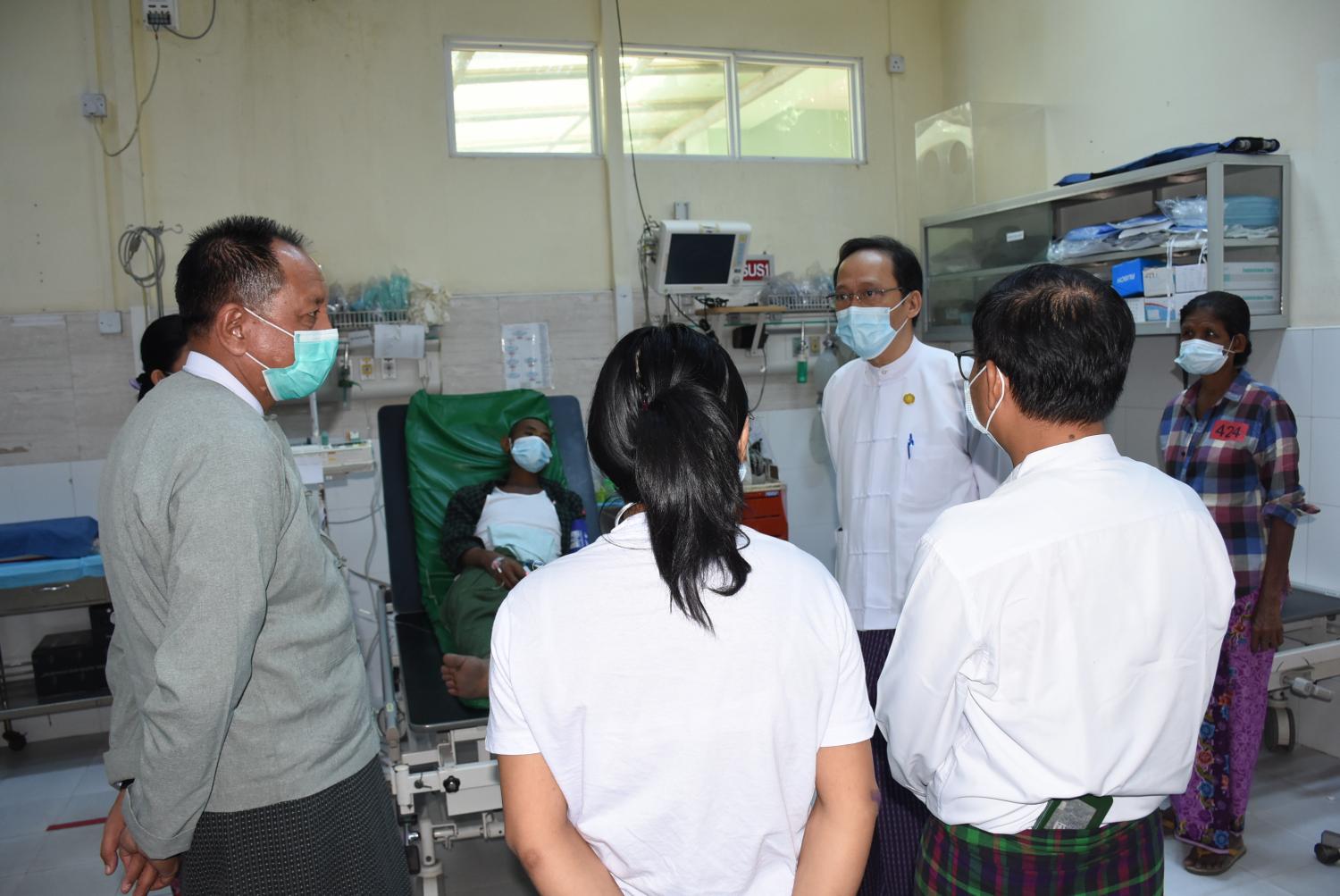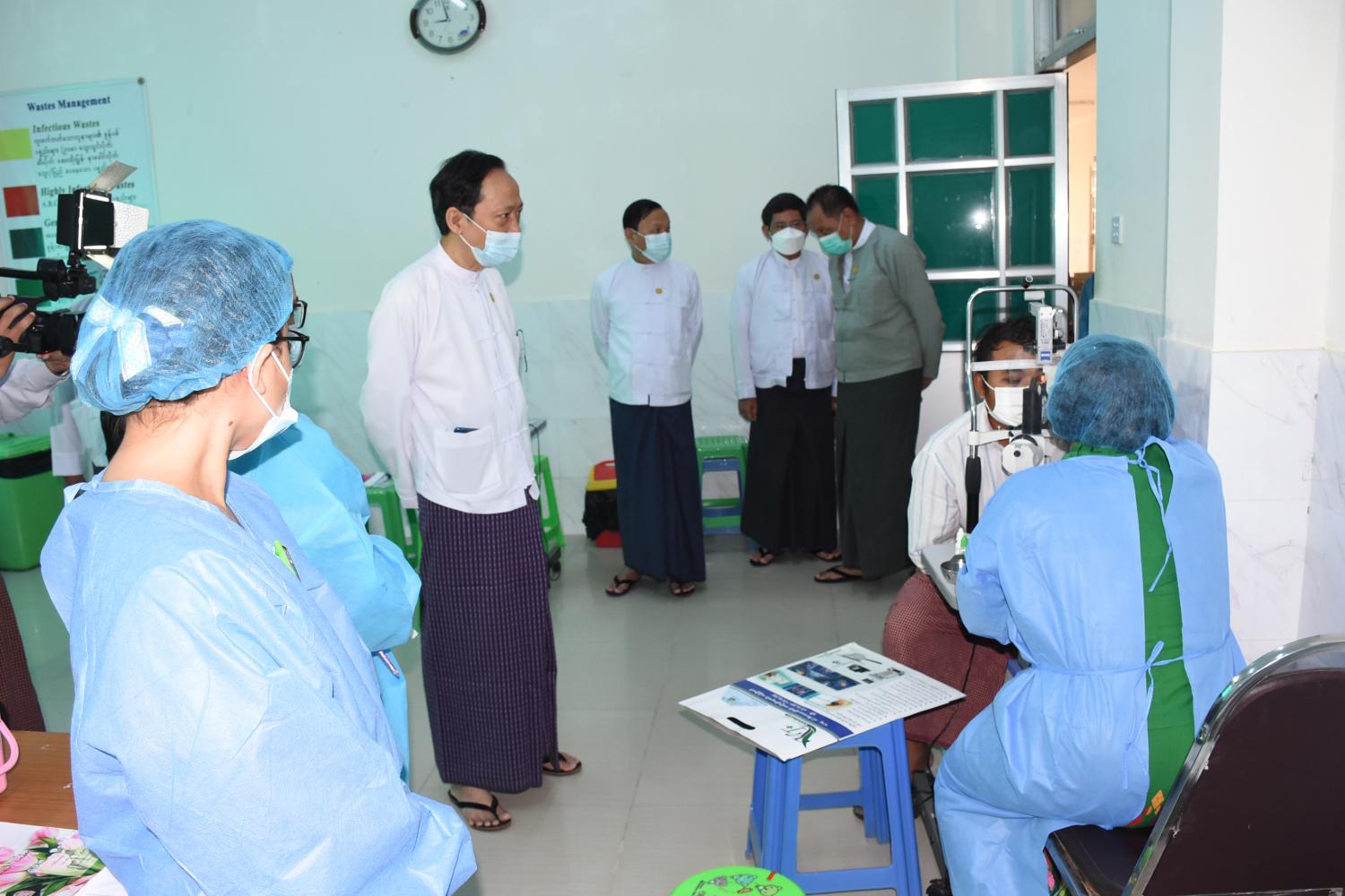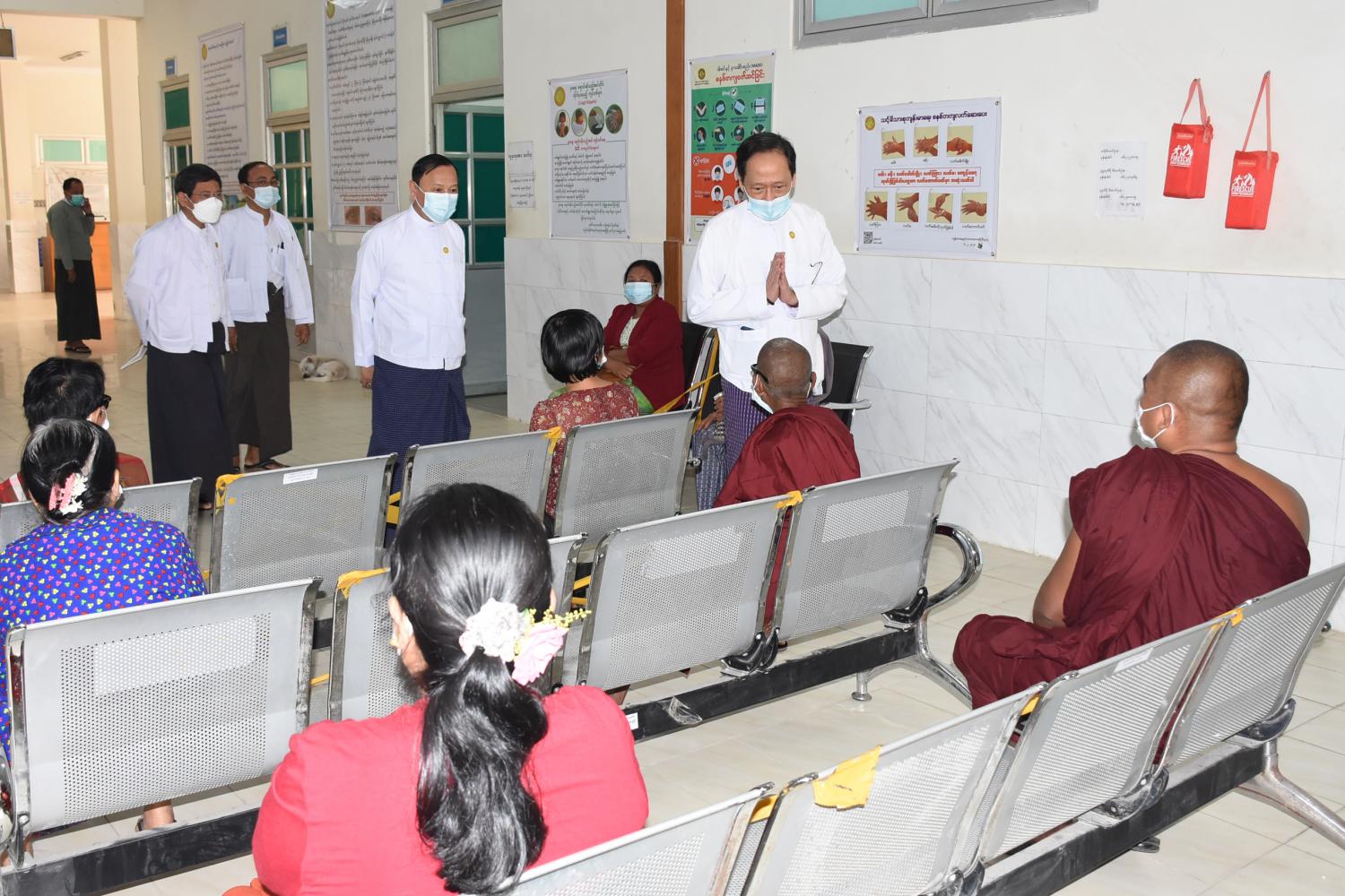 ရှေးဉီးစွာ ပြည်ထောင်စုဝန်ကြီး ဒေါက်တာသက်ခိုင်ဝင်း၊ ဒုတိယဝန်ကြီး ဦးမျိုးလှိုင်နှင့် တာဝန် ရှိသူများသည် မျက်စိ၊ နား၊ နှာခေါင်း၊ လည်ချောင်းနှင့် ဦးခေါင်းခွဲစိတ်ရောဂါ အထူးကု ဆေးရုံကြီး-နေပြည်တော်၊ ပြင်ပလူနာဌာနသို့ ရောက်ရှိကြပြီး ဆေးရုံအုပ်ကြီးနှင့်အတူ မျက်စိ ရောဂါ ကုသမှုလာရောက်ခံယူလျက်ရှိသော လူနာများအား လှည့်လည်ကြည့်ရှု၍ လိုအပ်ချက် များကို မေးမြန်းကာ အားပေးစကားပြောကြားသည်။