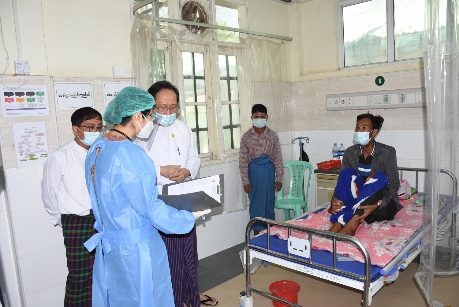 ထို့နောက် ပြည်ထောင်စုဝန်ကြီးနှင့်အဖွဲ့သည် နေပြည်တော် ပြည်သူ့ဆေးရုံကြီး (ခုတင်-၁၀၀၀) အရေးပေါ်လူနာဌာနသို့ ရောက်ရှိပြီး အရေးပေါ်ကုသမှုခံယူလျက်ရှိသည့် လူနာများအား လှည့်လည်ကြည့်ရှုသည်။