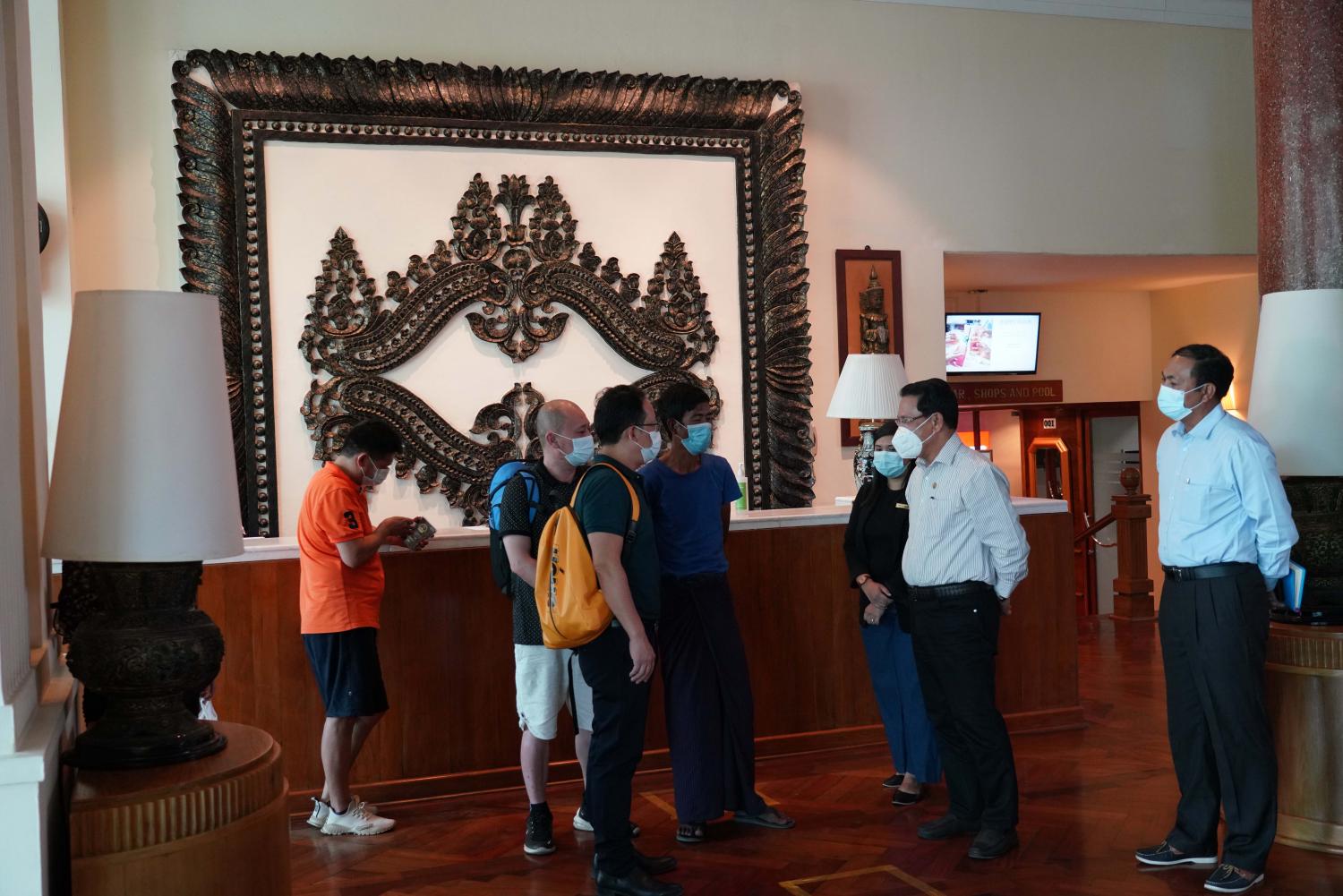 ယင်းနောက် ပြည်ထောင်စုဝန်ကြီးက ကိုဗစ်-၁၉ ဆိုင်ရာ သတ်မှတ်စည်း မျဉ်း စည်းကမ်း ချက်များနှင့်အညီ ဖွင့်လှစ်ထားရှိသည့် Inya Lake Hotel အား ကြည့်ရှုစစ်ဆေးပြီး ဟိုတယ် အတွင်း တည်းခိုနေသည့် နိုင်ငံခြားသားဧည့်သည်များကို ရင်းရင်းနှီးနှီးတွေ့ဆုံ နှုတ်ဆက် သည်။ ထို့နောက် Inya Lake Hotel ၊ Ruby ခန်းမ၌ မြန်မာနိုင်ငံခရီးသွား လုပ်ငန်းအဖွဲ့ ချုပ်နှင့် ညီနောင်အသင်းများမှ ဥက္ကဌနှင့် တာဝန်ရှိသူများကို တွေ့ဆုံ၍ နိုင်ငံတော်စီမံ အုပ်ချုပ်ရေးကောင်စီဥက္ကဌက ခရီးသွားလုပ်ငန်းကို အမြန်ဆုံးပြန်လည်စတင်သွားရန်နှင့် သက်ဆိုင်ရာဝန်ကြီး ဌာနများက ပူးပေါင်းဆောင်ရွက် သွားရန် အထူးအလေးအနက်ထားမှာ ကြားခဲ့သည့်အတွက် လာရောက်ခြင်းဖြစ်ပါကြောင်း ယခုအခါ တိုင်းဒေသကြီး/ ပြည်နယ်များသို့ ပြည်သူများ ကိုဗစ်-၁၉ ကာလအလွန် မွန်းကြပ်နေသော စိတ်ခံစားမှုများလျော့ပါးပြီး ပျော်ရွှင် ချမ်းမြေ့စွာ ခရီးသွားလာ အပန်းဖြေနိုင်ရေးအတွက် ခရီးသွား ကန့်သတ်ချက် များ တပြေးညီ ဖြေလျော့ပေးခြင်း၊ ဟိုတယ်/မိုတယ်များ ဖွင့်လှစ်ပေးခြင်းနှင့် အဝေးပြေး ခရီးသည်တင် ယာဥ်လိုင်းများကိုလည်း ပြန်လည်ဖွင့်လှစ်ထားရှိပြီးဖြစ်ပါကြောင်း၊ ကိုဗစ်-၁၉ ကြောင့် ဟိုတယ် နှင့် ခရီးသွား လုပ်ငန်းများ ကာလရှည်ကြာစွာ ရပ်ဆိုင်းထားရသဖြင့် လုပ်ငန်းရှင်များ အခက် အခဲများ ဖြစ်ပေါ် နေသည်ကို သိရှိရကြောင်း။