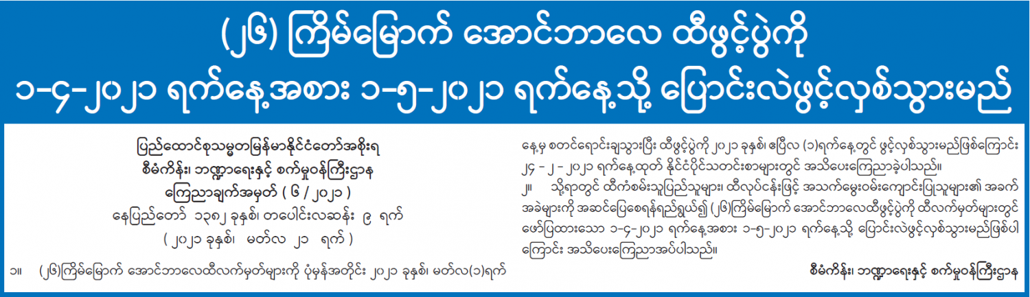 ( ၂၆ ) ကြိမ်မြောက် အောင်ဘာလေ ထီဖွင့်ပွဲကို ၁ - ၄ - ၂၀၂၁ ရက်နေ့အစား ၁ - ၅ -၂၀၂၁ ရက်နေ့သို့ ပြောင်းလဲဖွင့်လှစ်သွားမည် 03/22/2021 နေပြည်တော်