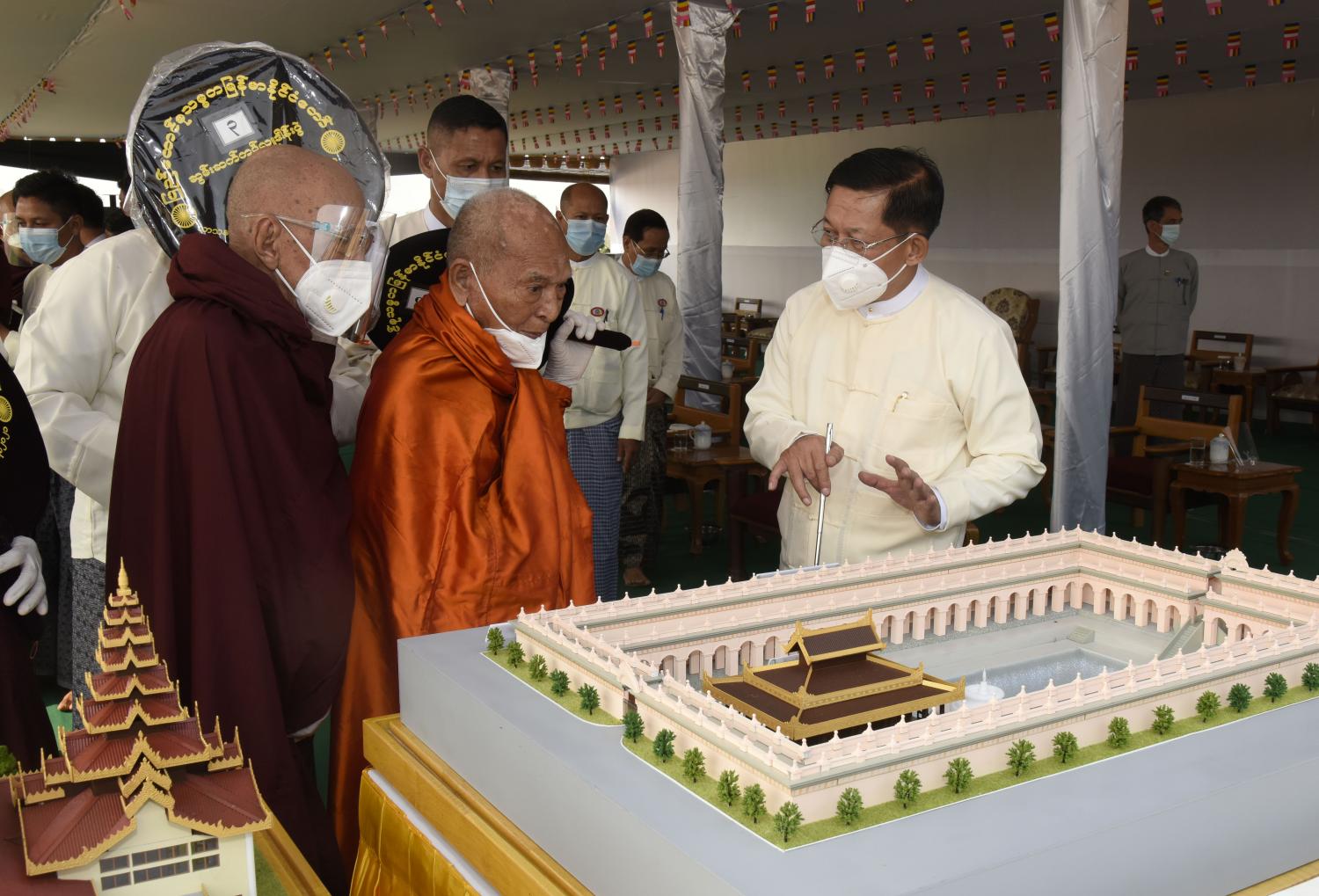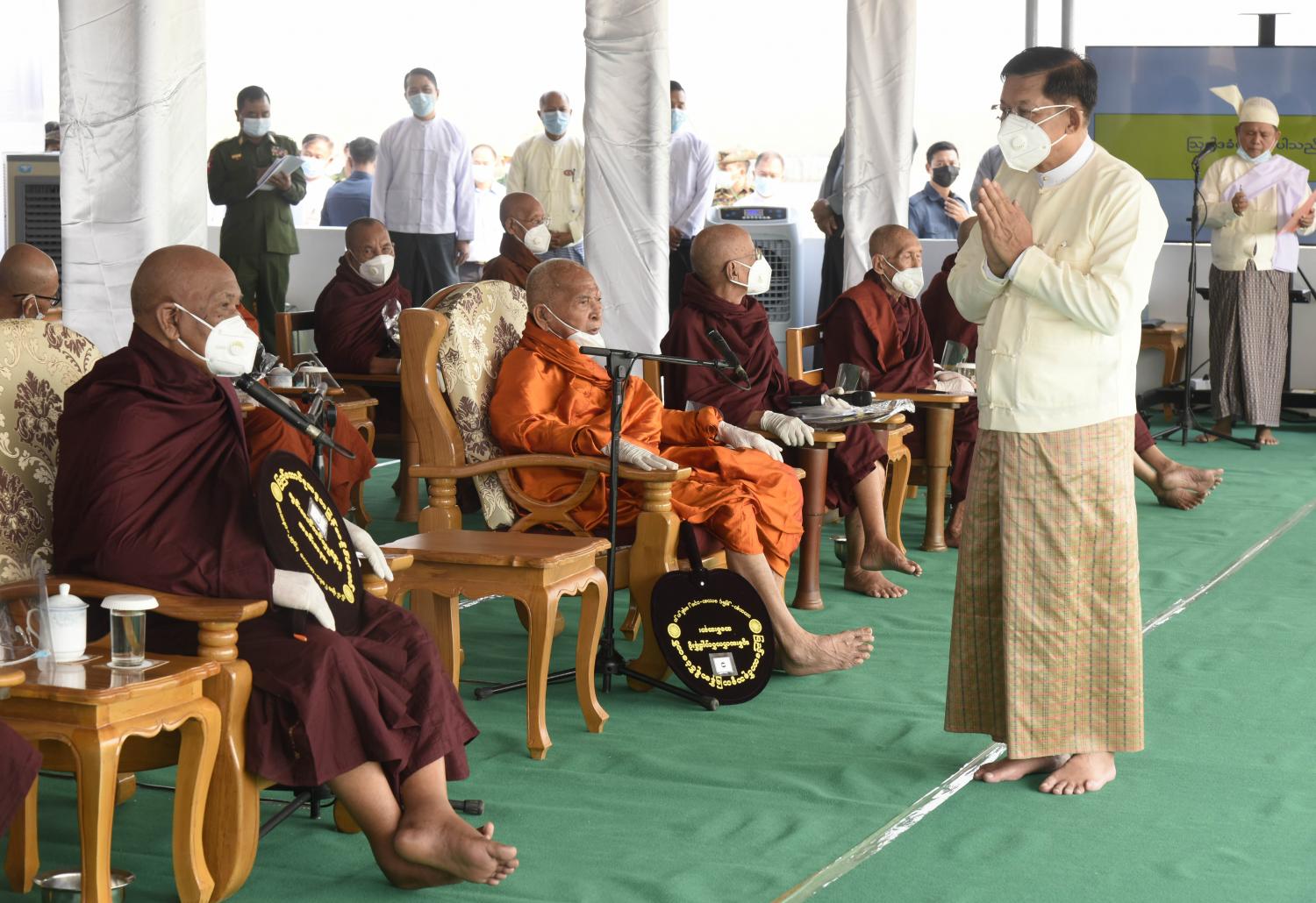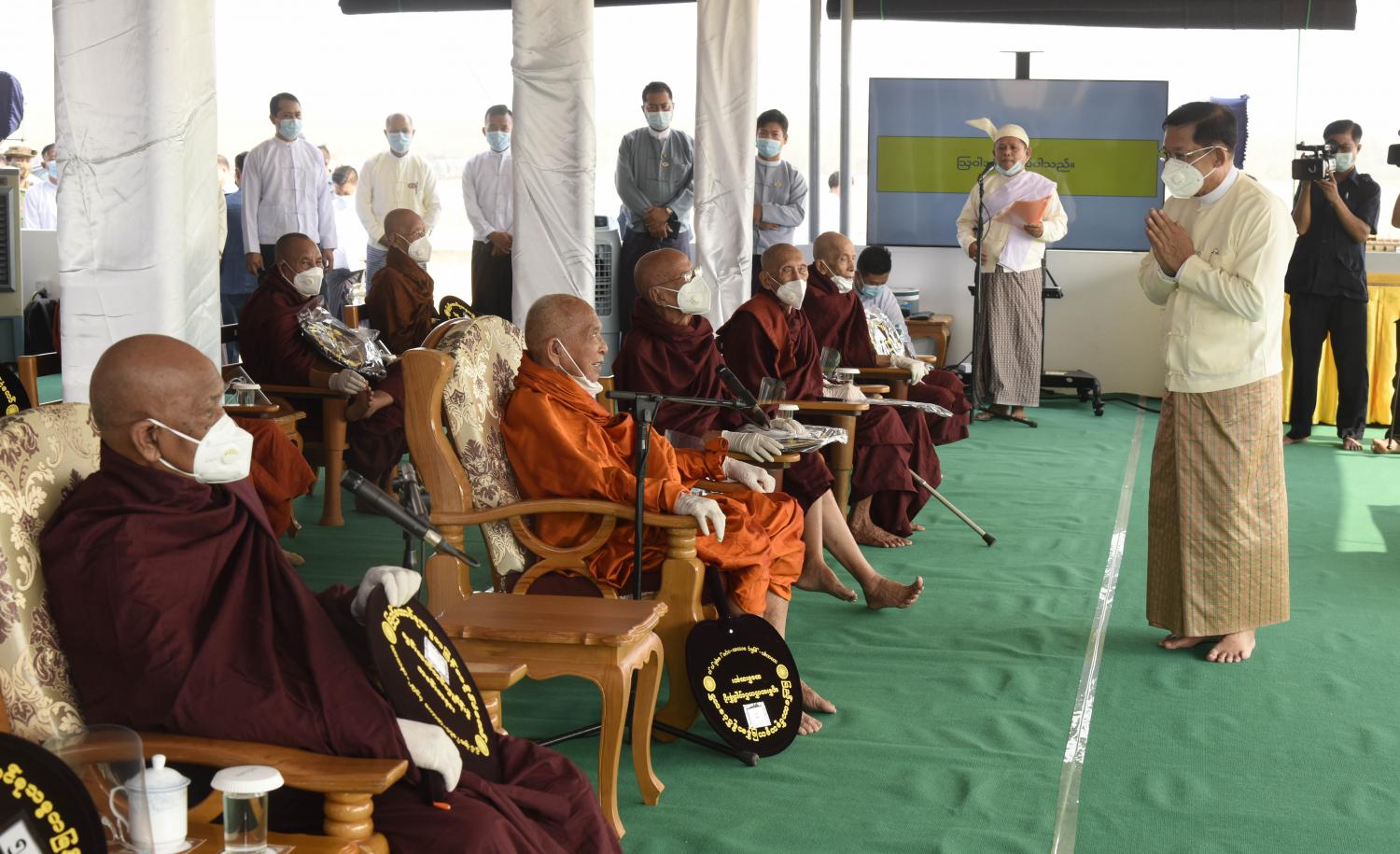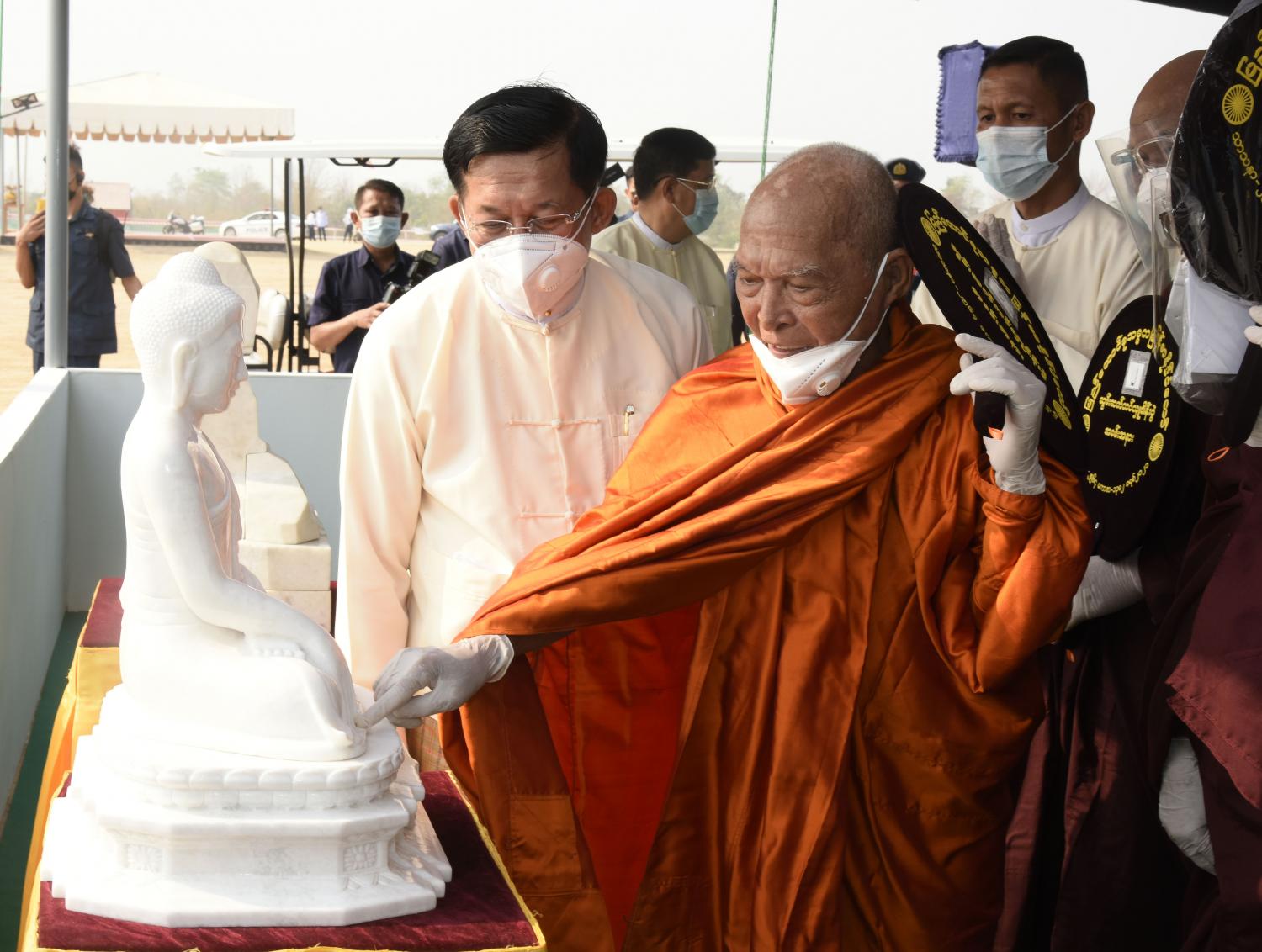 နေပြည်တော်၊ မတ် - ၂၅ ပြည်ထောင်စုနယ်မြေ၊ နေပြည်တော်၊ ဒက္ခိဏသီရိမြို့နယ်ရှိ ဗုဒ္ဓဥယျာဉ်တော်တွင် တည်ထားပူဇော်မည့် ဘူမိဖဿမုဒြာ ထိုင်တော်မူကျောက်ဆစ်ဗုဒ္ဓရုပ်ပွားတော်မြတ်ကြီး တည်ဆောက်ရေးလုပ်ငန်းဆိုင်ရာများအား နိုင်ငံတော်သံဃမဟာနာယကအဖွဲ့ ဆရာတော် ကြီးများထံသို့ တင်ပြလျှောက်ထားခြင်းနှင့် ဩဝါဒခံယူခြင်းအခမ်းအနားကို ယနေ့နံနက်ပိုင်း တွင် ရုပ်ပွားတော်မြတ်ကြီးတည်ထားကိုးကွယ်မည့် ဒက္ခိဏသီရိ မြို့နယ်ရှိ ဗုဒ္ဓဥယျာဉ်တော် မင်္ဂလာနေရာ၌ ကျင်းပပြုလုပ်သည်။ အခမ်းအနားသို့ နိုင်ငံတော်သံဃမဟာနာယကအဖွဲ့ဥက္ကဋ္ဌ၊ မန္တလေးမြို့၊ ဗန်းမော် ကျောင်းတိုက် ပဓာနနာယက၊ အဘိဓဇမဟာရဋ္ဌဂုရု၊ အဘိဓဇအဂ္ဂမဟာ သဒ္ဓမ္မဇောတိက ဒေါက်တာဘဒ္ဒန္တကုမာရာဘိဝံသ ဗန်းမော်ဆရာတော်ကြီး၊ နိုင်ငံတော် သံဃမဟာနာယကအဖွဲ့ အကျိုးတော်ဆောင်၊ သန်လျင်မြို့၊ မင်းကျောင်းပထမပြန် စာသင် တိုက် ပဓာနနာယက အဂ္ဂမဟာပဏ္ဍိတ၊ အဂ္ဂမဟာသဒ္ဓမဇောတိကဓဇ ဒေါက်တာ ဘဒ္ဒန္တစန္ဒိမာ ဘိဝံသနှင့် ဘွဲ့တံဆိပ်တော်ရဆရာတော်၊သံဃာတော်များ ကြွရောက်ချီးမြှင့်တော်မူကြပြီး နိုင်ငံတော်စီမံအုပ်ချုပ်ရေးကောင်စီဥက္ကဋ္ဌ တပ်မတော်ကာကွယ်ရေးဦးစီးချုပ် ဗိုလ်ချုပ်မှူးကြီး မင်းအောင်လှိုင်၊ ကောင်စီဒုတိယဥက္ကဋ္ဌ ဒုတိယတပ်မတော်ကာကွယ်ရေးဦးစီးချုပ် ကာကွယ်ရေး ဦးစီးချုပ်(ကြည်း) ဒုတိယဗိုလ်ချုပ်မှူးကြီး စိုးဝင်း၊ သာသနာရေးဝန်ကြီးဌာန ပြည်ထောင်စု ဝန်ကြီး ဦးကိုကို၊ နေပြည်တော်ကောင်စီဥက္ကဋ္ဌ ဒေါက်တာ မောင်မောင်နိုင်၊ ကာကွယ်ရေးဦးစီး ချုပ်ရုံးမှ တပ်မတော်အရာရှိကြီးများ၊ နေပြည်တော်တိုင်းစစ်ဌာနချုပ်တိုင်းမှူးနှင့် ဖိတ်ကြား ထားသည့် ဧည့်သည်တော်များ တက်ရောက်ကြည်ညိုကြသည်။ ဦးစွာ နမောတဿ သုံးကြိမ်ရွတ်ဆိုဘုရားကန်တော့၍ အခမ်းအနားအားဖွင့်လှစ်ပြီး ဦးဆောင်ဘုရားဒါယကာ နိုင်ငံတော်စီမံအုပ်ချုပ်ရေးကောင်စီဥက္ကဋ္ဌ တပ်မတော်ကာကွယ်ရေး ဦးစီးချုပ်က ဗုဒ္ဓရုပ်ပွားတော်မြတ်ကြီး တည်ဆောက်ပူဇော်ရေးနှင့် စပ်လျဉ်း၍ တင်ပြ လျှောက်ထားရာတွင် နေပြည်တော်၌ ဉာဏ်တော် ၈၁ ပေအမြင့်ရှိ စကျင်ဆင်းတုတော်ကြီးကို မြန်မာနိုင်ငံတွင် ထေရဝါဒဗုဒ္ဓသာသနာတော်ကြီး ခိုင်မာစွာထွန်းလင်းတောက်ပလျက်ရှိ သည်ကို ကမ္ဘာကိုပြသရန်၊ တိုင်းပြည်အေးချမ်းသာယာမှုရှိစေရန်၊ ရုပ်ပွာတော်မြတ် ကြီးအား ပြည်တွင်းပြည်ပ ဘုရားဖူးများ လာရောက်ခြင်းဖြင့် ဒေသတိုးတက်စည်ကားမှုဖြစ်စေရန်၊ နိုင်ငံတော်ဖွံ့ဖြိုးတိုးတက်မှုအထောက်အကူဖြစ်စေရန် စသည့် ရည်ရွယ်ချက် ၄ ရပ်ဖြင့် တည်ထားကိုးကွယ်ရန်လုပ်ဆောင်ခဲ့ခြင်းဖြစ်ပါကြောင်း၊ အဆိုပါဘူမိဖဿမုဒြာ ထိုင်တော်မူ ကျောက်ဆစ်ဗုဒ္ဓရုပ်ပွားတော်မြတ်ကြီးအဖြစ် ထုဆစ်ပူဇော်မည့် စကျင်